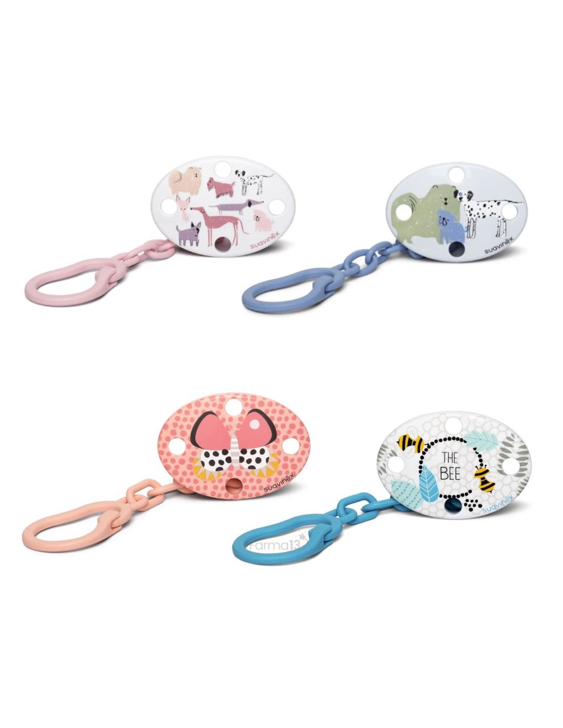 SUAVINEXEste broche de pinza con cadena y motivos infantiles tiene forma redonda y está diseñado para sujetar chupetes de manera segura y evitar que se caigan al suelo. Hay seis diseños disponibles en diferentes colores para elegir el que mejor se adapte a cada ocasión. Además, combinan perfectamente con los chupetes y biberones de la misma colección. Tenga en cuenta que el color y diseño del producto pueden variar según la disponibilidad.