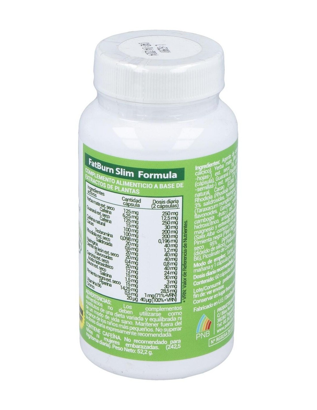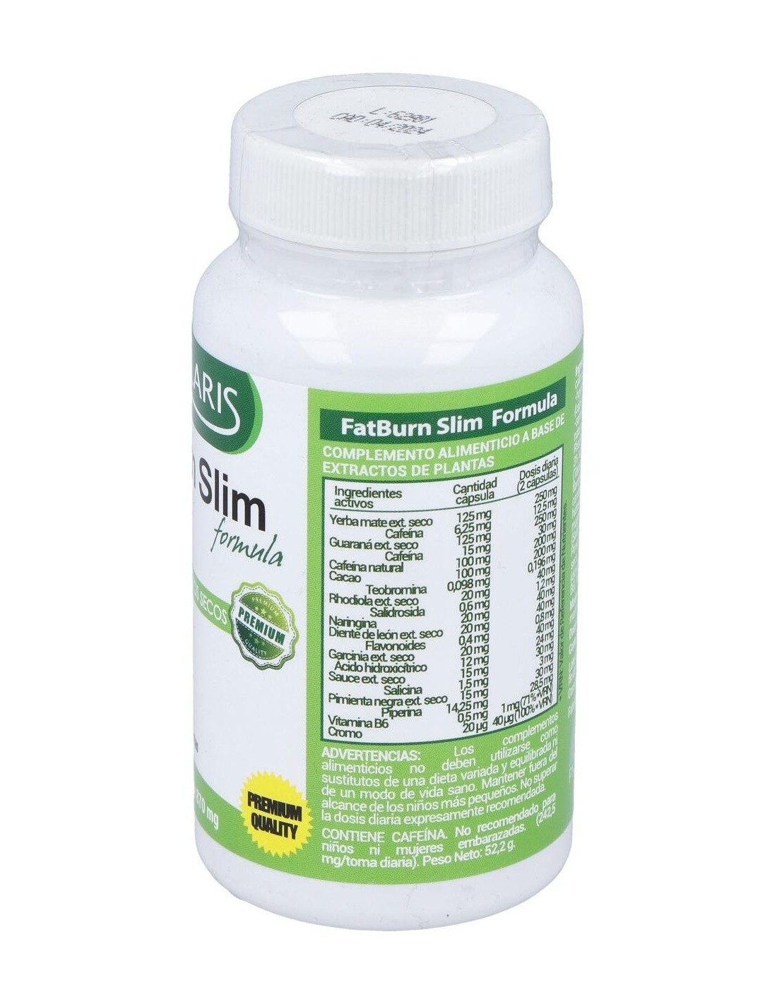 Complemento alimenticio en formato de cápsulas de gelatina que está especialmente ideado para ayudar a mantener un peso saludable, gracias a su compuesto elaborado a base de una fórmula especial de plantas y de extractos secos, como la yerba mate, cafeína y guaraná. Gracias a su compuesto a base de extractos de plantas con acción quema grasas, es ideal para combinar con una dieta sana y saludable.
