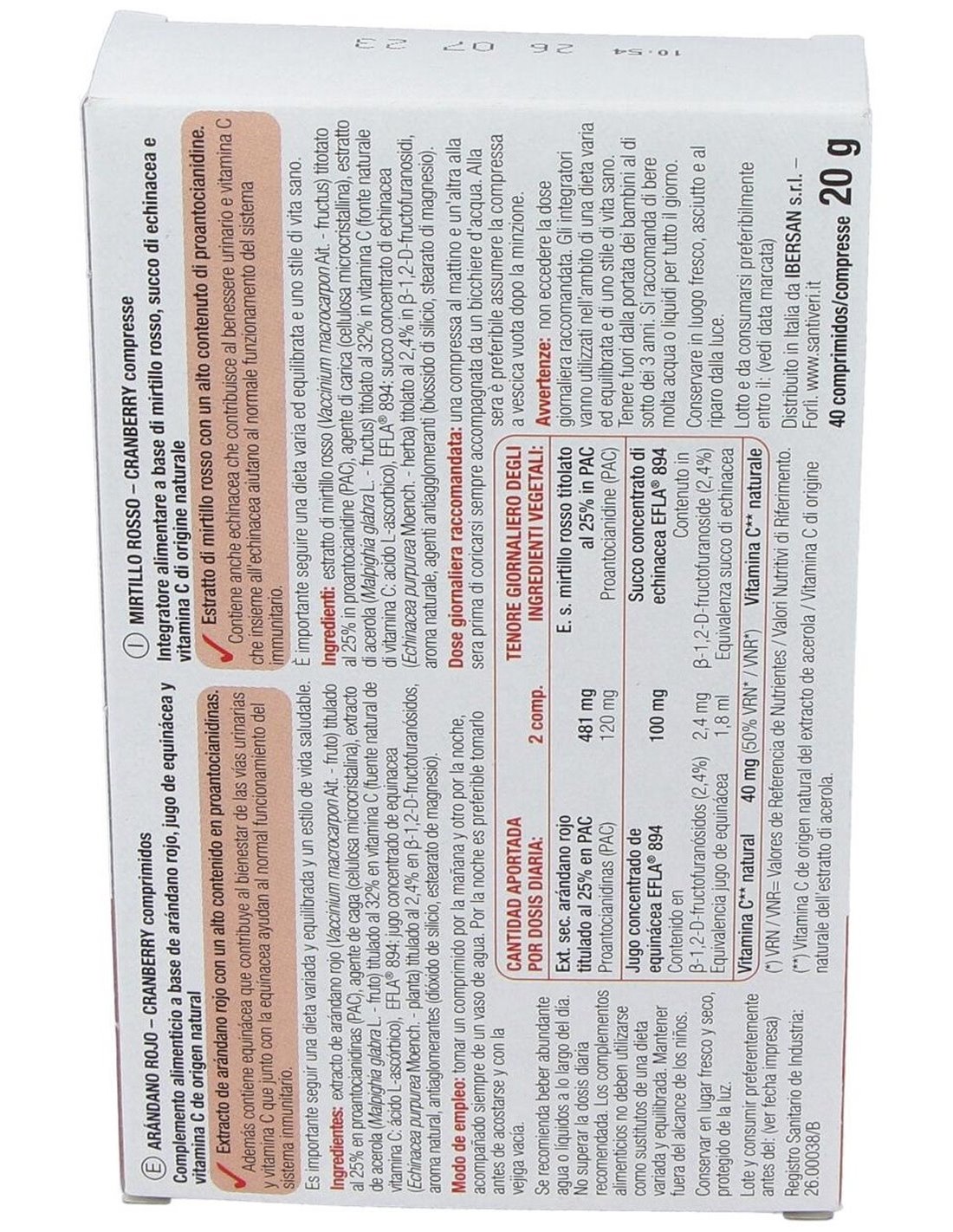 481 mg de extracto seco de arándano rojo titulado al 25% en PAC (proantocianidinas (PAC): 120 mg), 100 mg de jugo concentrado de equinácea (EFLA® 894) titulado al 2,4 % en 1,2-D-fructofuranósidos (1,2-D-fructofuranósidos: 2,4 mg) equivalentes a 1,8 ml de jugo fresco de equinácea, 40 mg (50% VRN) de Vitamina C natural procedente del extracto de acerola.