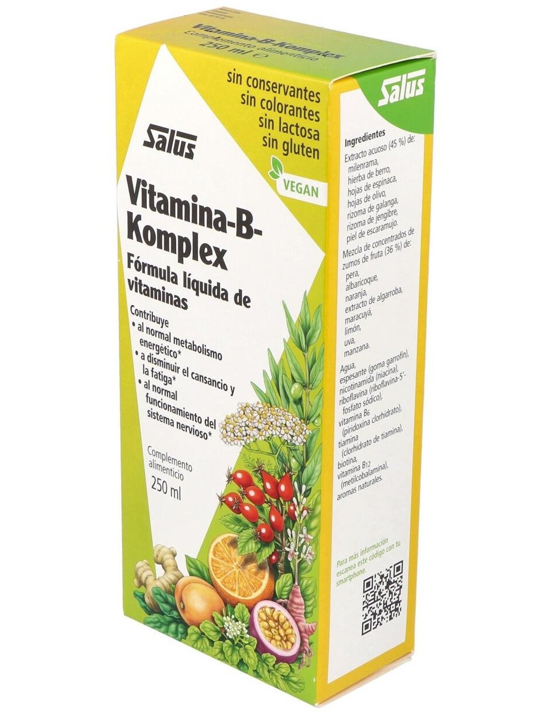Complemento alimenticio formulado con plantas, extractos frutales y un complejo de vitamina B. Presentación en jarabe bebible que contiene vitaminas B1, B2, B6 y B12. Contribuye al correcto funcionamiento del sistema inmune y a la disminución de los estados de fatiga. Indicado para adultos que quieran favorecer su bienestar general, incluyendo veganos, vegetarianos, mujeres embarazadas o lactantes. No apto para menores de 6 años.