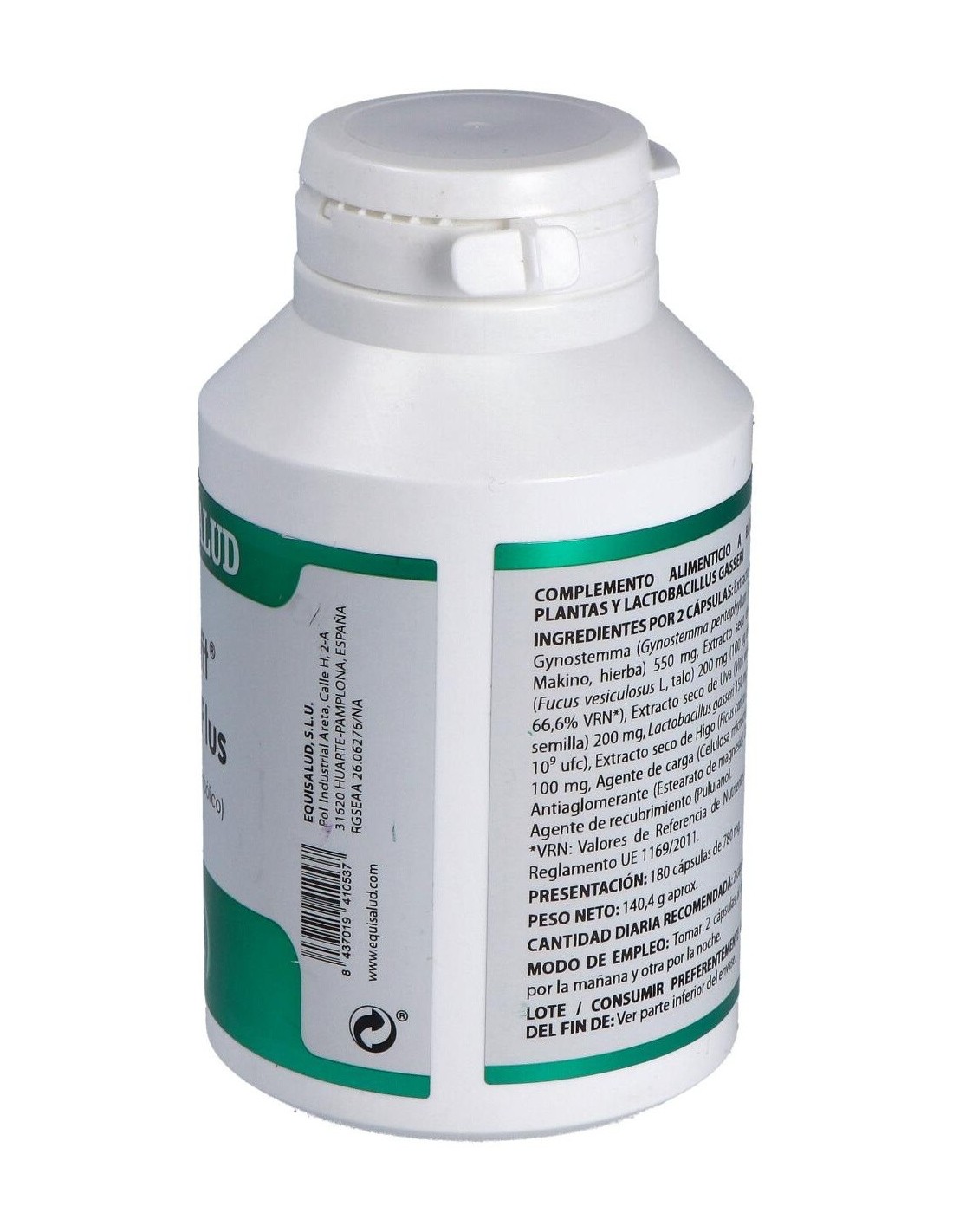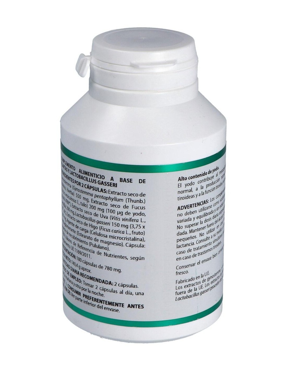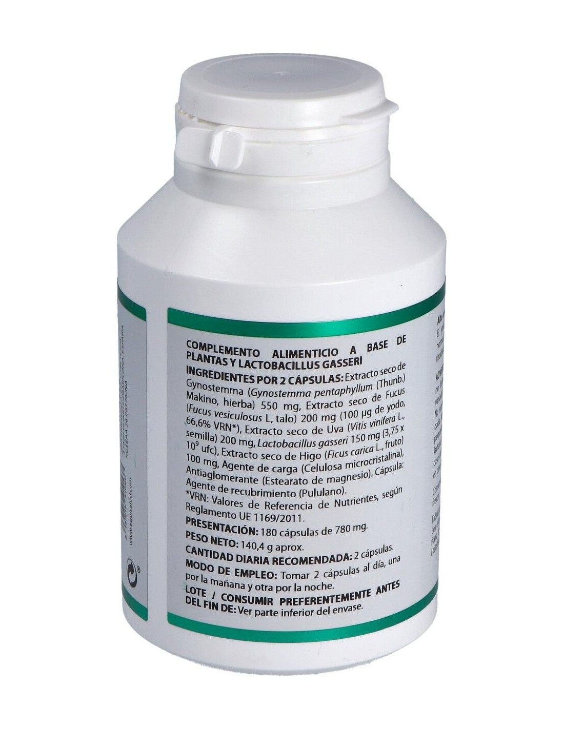 Jiaogulan* extracto seco (Gynostemma pentaphyllum (Thunb.) Makino), 275 mg: fucus* extracto seco (Fucus vesiculosus L.), 100 mg: uva* (Vitis vinifera L.), 100 mg: Lactobacillus gasseri* (en maltodextrina de maíz, 2,5×10(10) UFC/g), 75 mg: higo* (Ficus carica L.), 50 mg. Envoltura: polisacárido de origen vegetal (pululano).