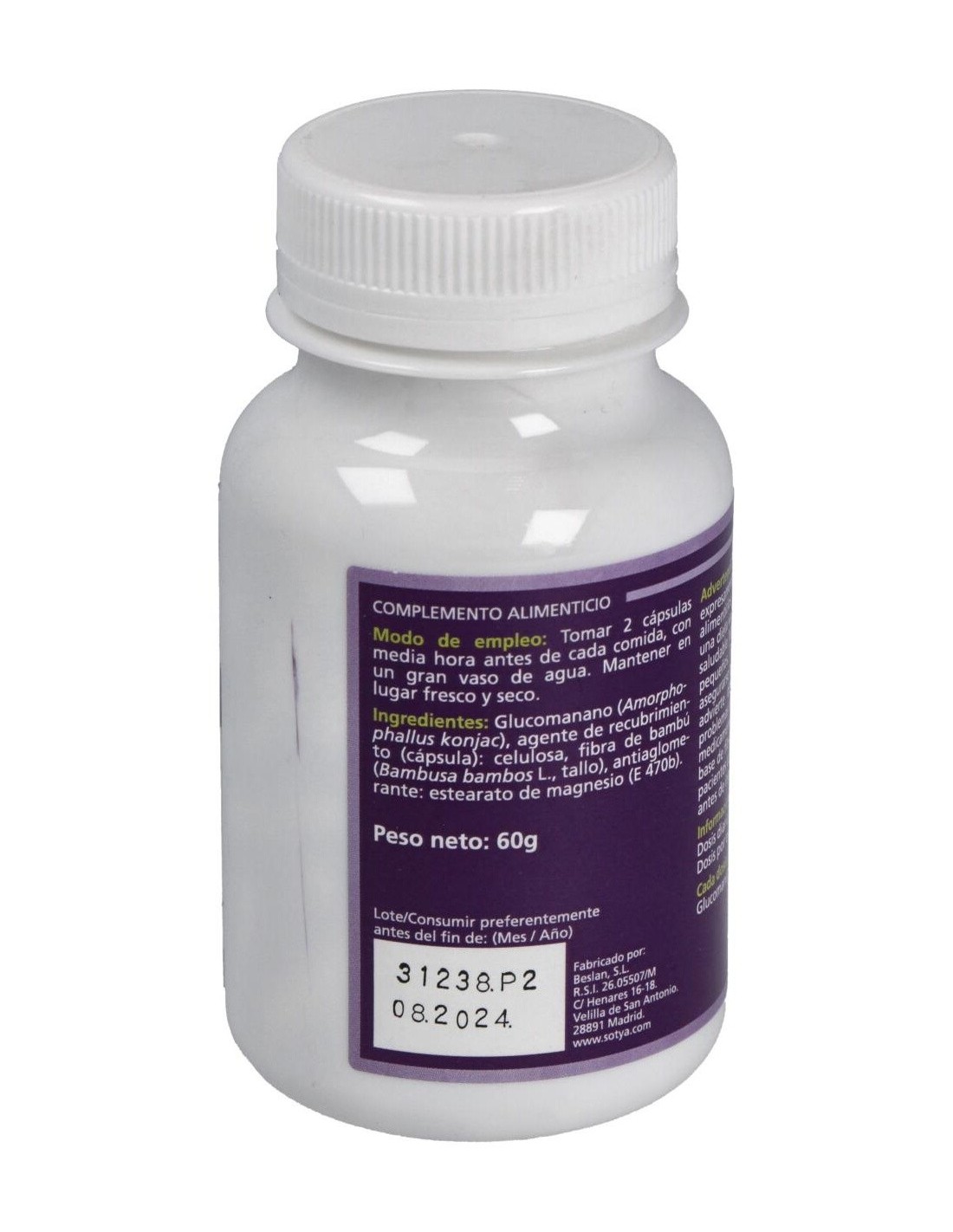 - Cada cápsula contiene 600 mg de glucomanano, una fibra derivada de la raíz de konjac que contribuye a la sensación de saciedad.