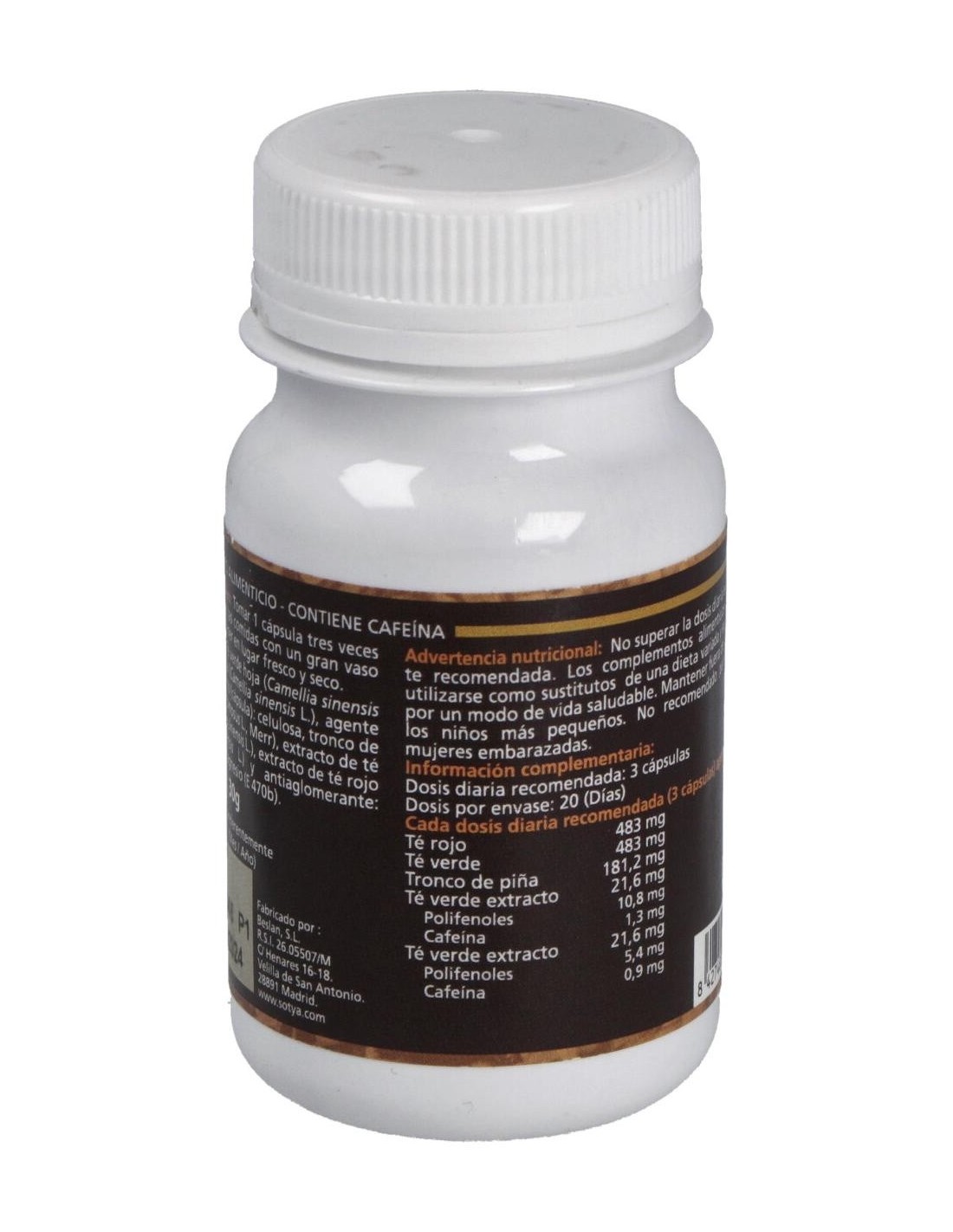 El Té Rojo+Té Verde+Piña 500Mg Cáps. 60U de Sotya es un suplemento natural para personas que buscan apoyar su bienestar diario, combinando extractos de té rojo, té verde y piña en una fórmula práctica y dosificada.
