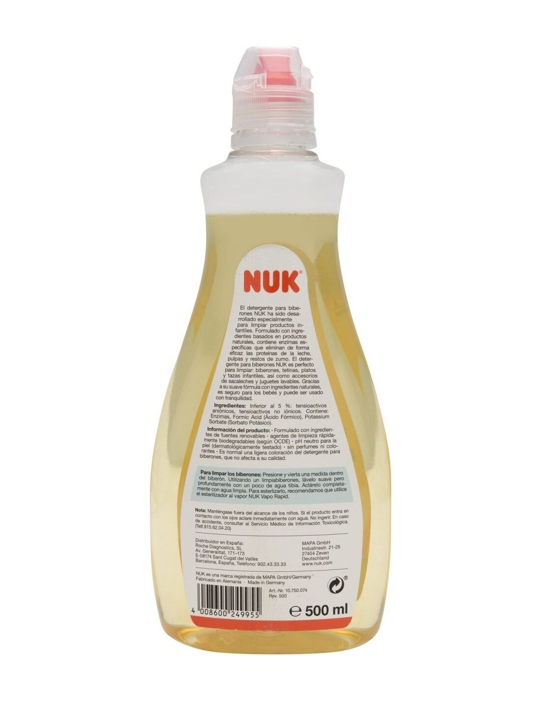 Especial para biberones y tetinas. Formulado con ingredientes naturales, sin perfumes ni colorantes. Particularmente eficaz con los restos de leche, puré o zumo. Aclarado fácil y rápido. pH neutro (dermatológicamente probado).