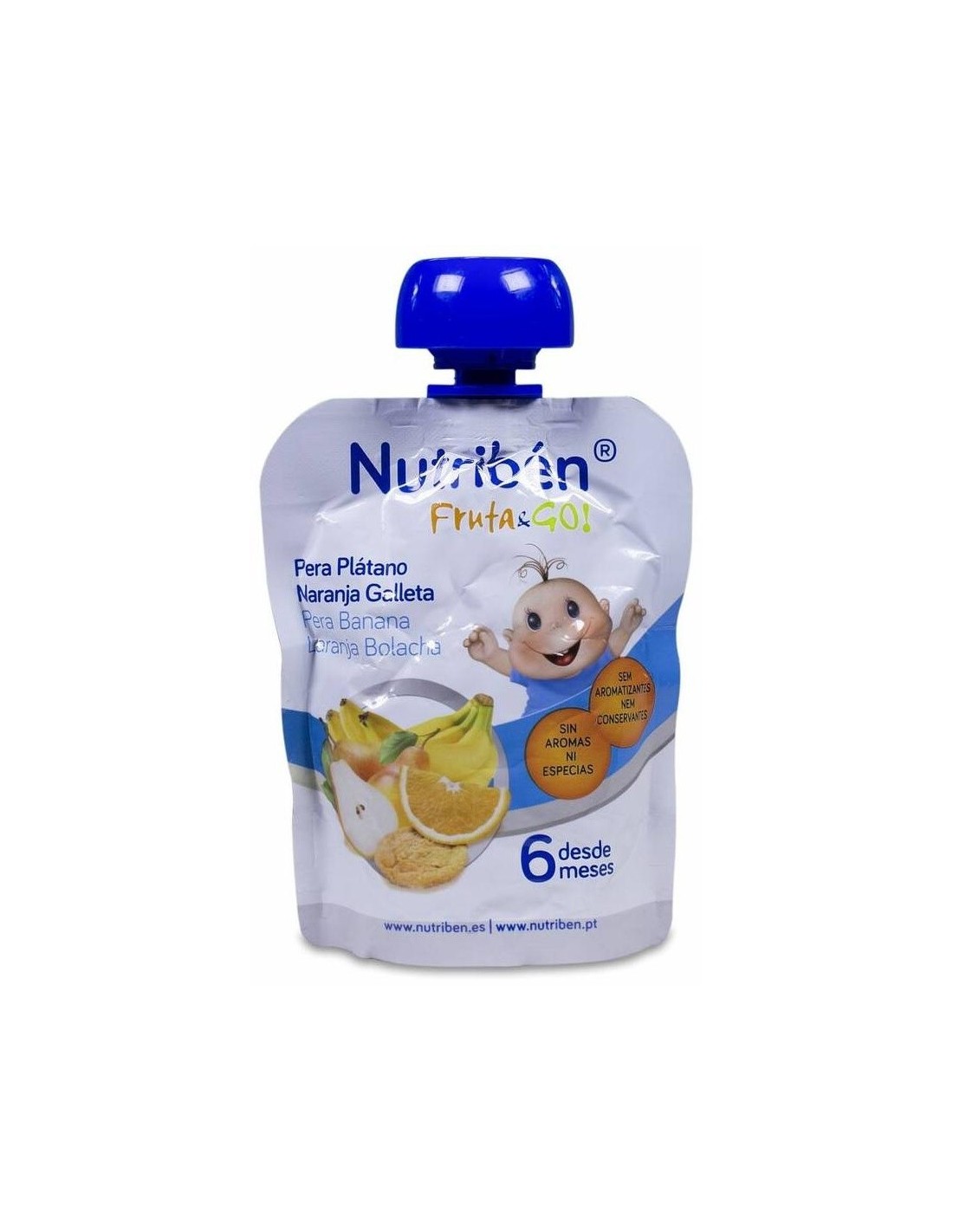 Puré de pera (33%), Puré de plátano (30%), Zumo de naranja (28%), Zumo de uva (5%), Galleta maría en polvo (4%) (Harina de trigo, agua, azúcar moreno de caña, almidón de trigo, aceites vegetales (girasol y oliva), extracto de malta en polvo, gasificantes (bicarbonato amónico y bicarbonato sódico), emulgente (lecitina de girasol), agente de tratamiento de la harina (L-cisteína) y antioxidantes (extracto rico en tocoferoles y palmitato de ascorbilo), Zumo concentrado de limón.