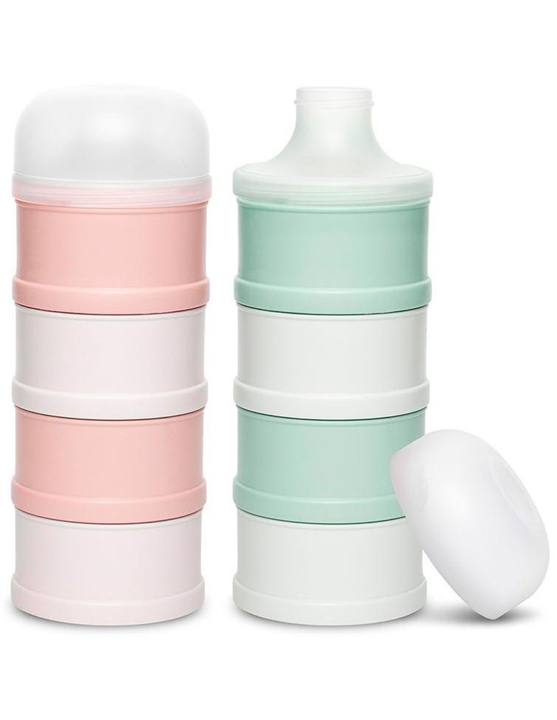 La estructura de este dosificador de leche en polvo contiene 4 apartados independientes, apilables e intercambiables, con una boquilla que vierte la leche sin que se derrame.