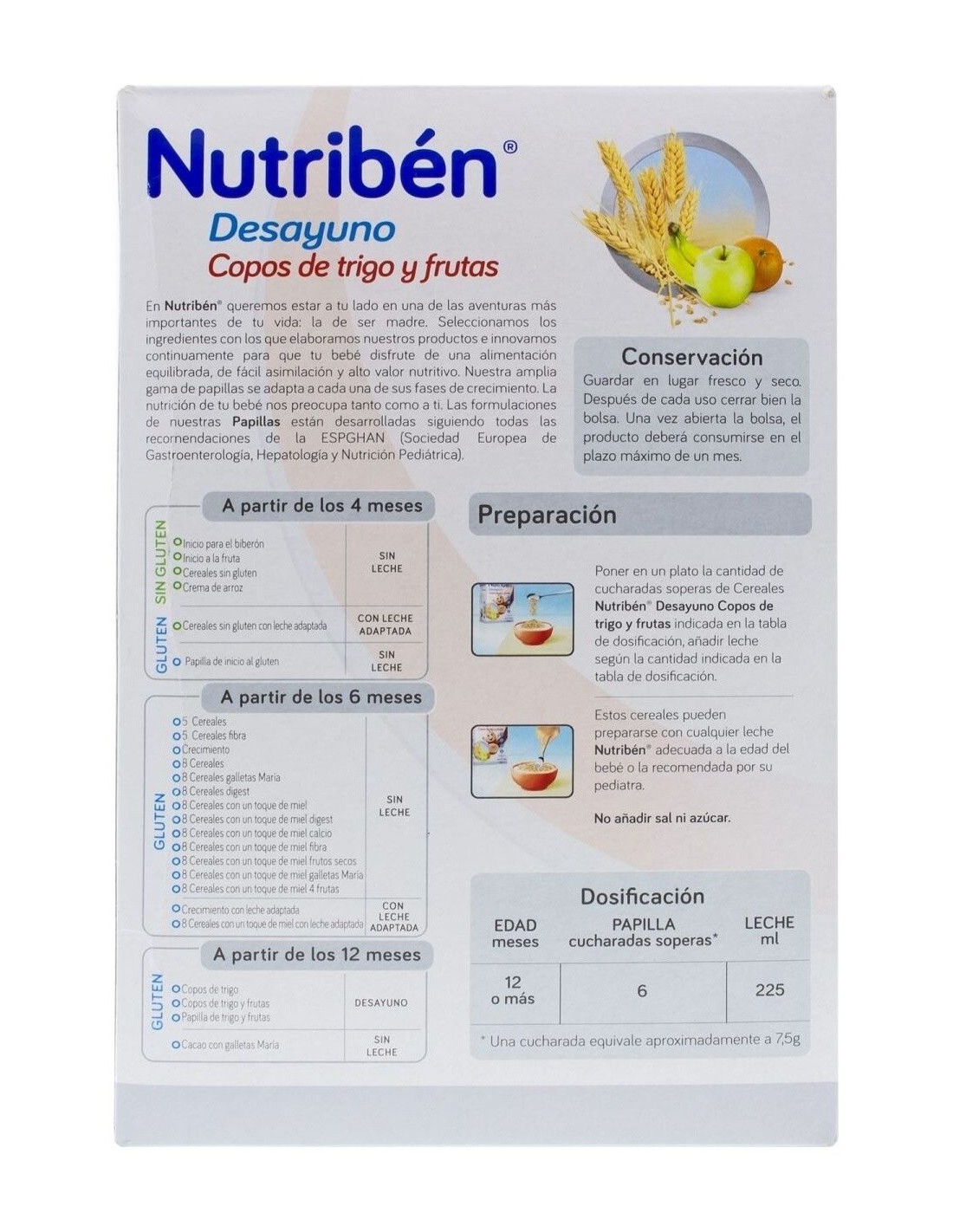1. Poner en un plato la cantdad de cucharadas soperas de Nutribén® Desayuno copos de trigo y fruta indicada en la tabla de dosificación.\ 2. Añadir leche según la cantdad indicada en la tabla de dosificación.\ \ El estuche debe guardarse en lugar fresco y seco. Después de cada uso cerrar bien la bolsa. Una vez abierta la bolsa el producto deberá consumirse en el plazo máximo de un mes.