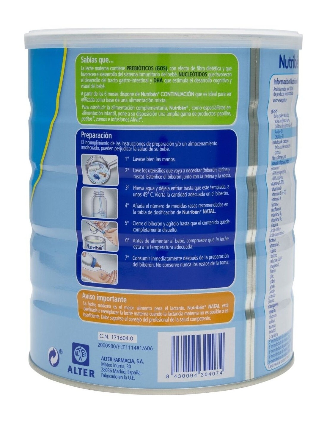Nutribén® Natal 0-6 meses 800g ha sido creado para cubrir las carencias de la alimentación del bebé desde el primer día de vida, pudiendo alargarse su aportación nutritiva hasta los 6 meses. Además, contiene componentes que participan en el crecimiento, estimulan las defensas y favorecen el desarrollo del sistema nervioso del bebé.
