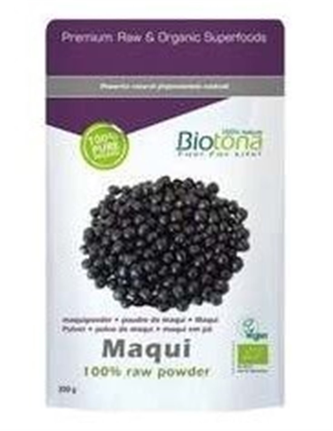 El Maqui Raw 150Gr. Bio de Biotona es un suplemento natural para personas interesadas en nutrición saludable, que aporta antioxidantes gracias a su polvo orgánico de maqui crudo y certificado.