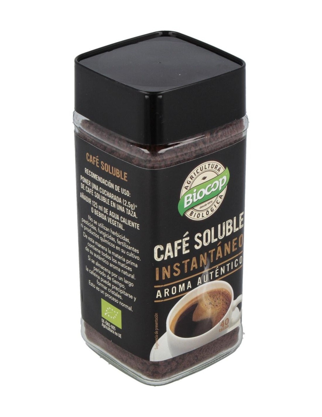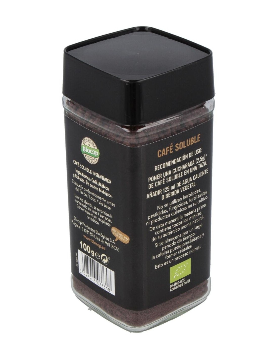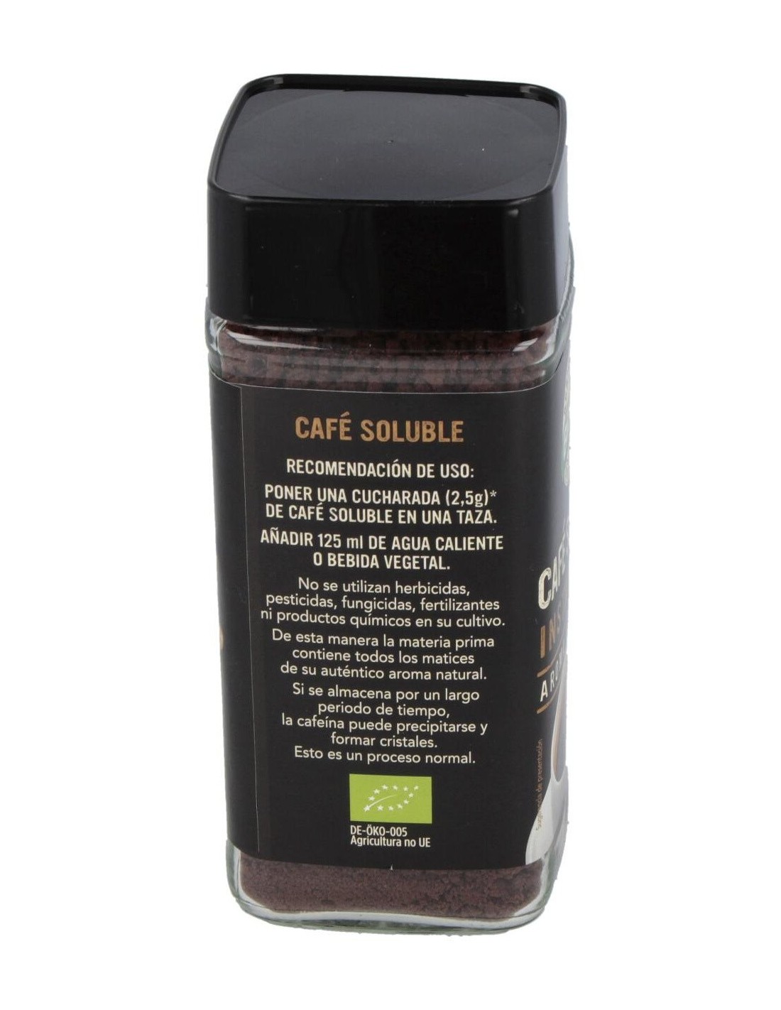 Modo de empleo:Poner una cucharada (2.5g) de café soluble en una taza. Añadir 125ml de agua caliente o bebida vegetal y remover.Presentación:Envase de 100 gramos.