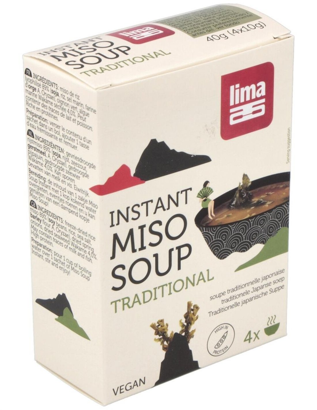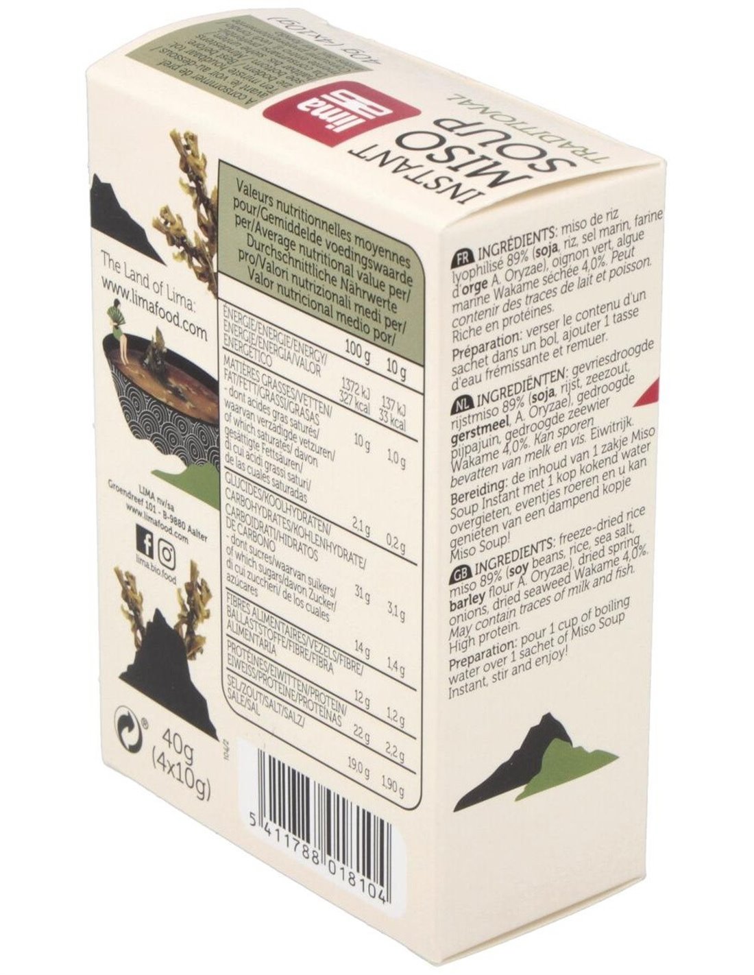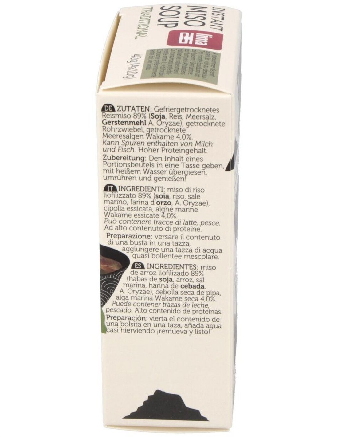 Ingredientes:Miso de arroz liofilizado 89% (soja, arroz, CEBADA, sal marina, A. Oryzae), cebolletas secas, alga wakame 4%.Valor nutricional por 100 gr