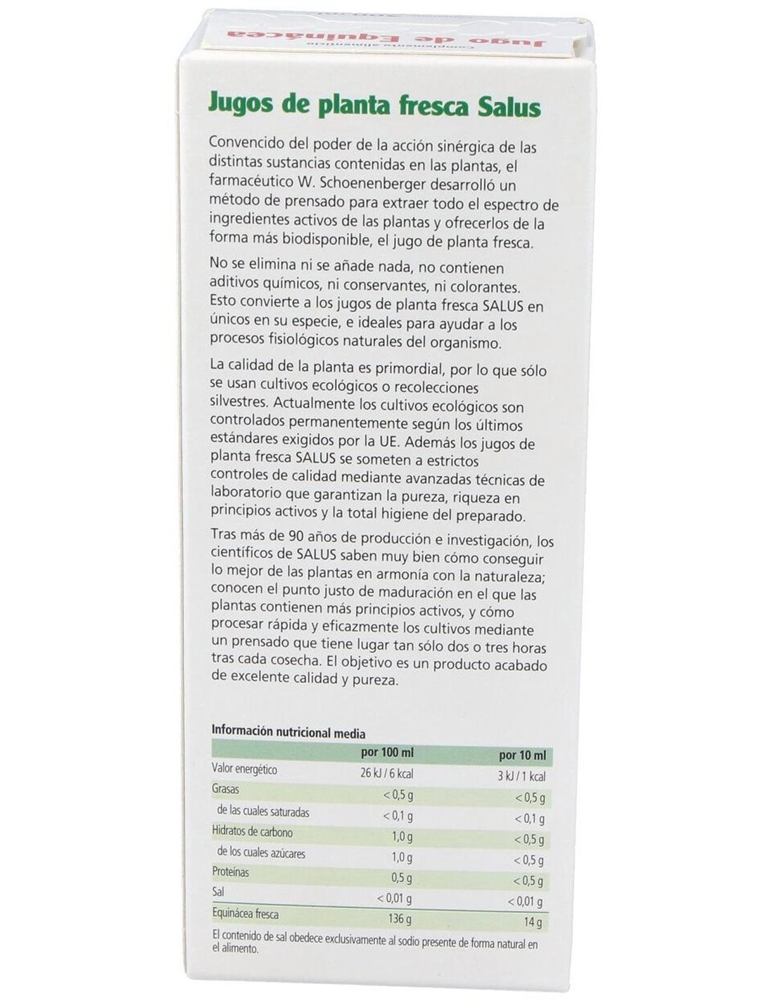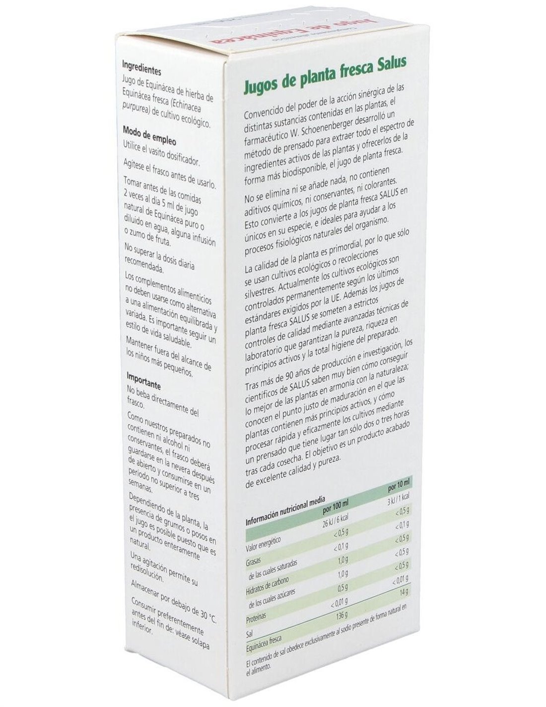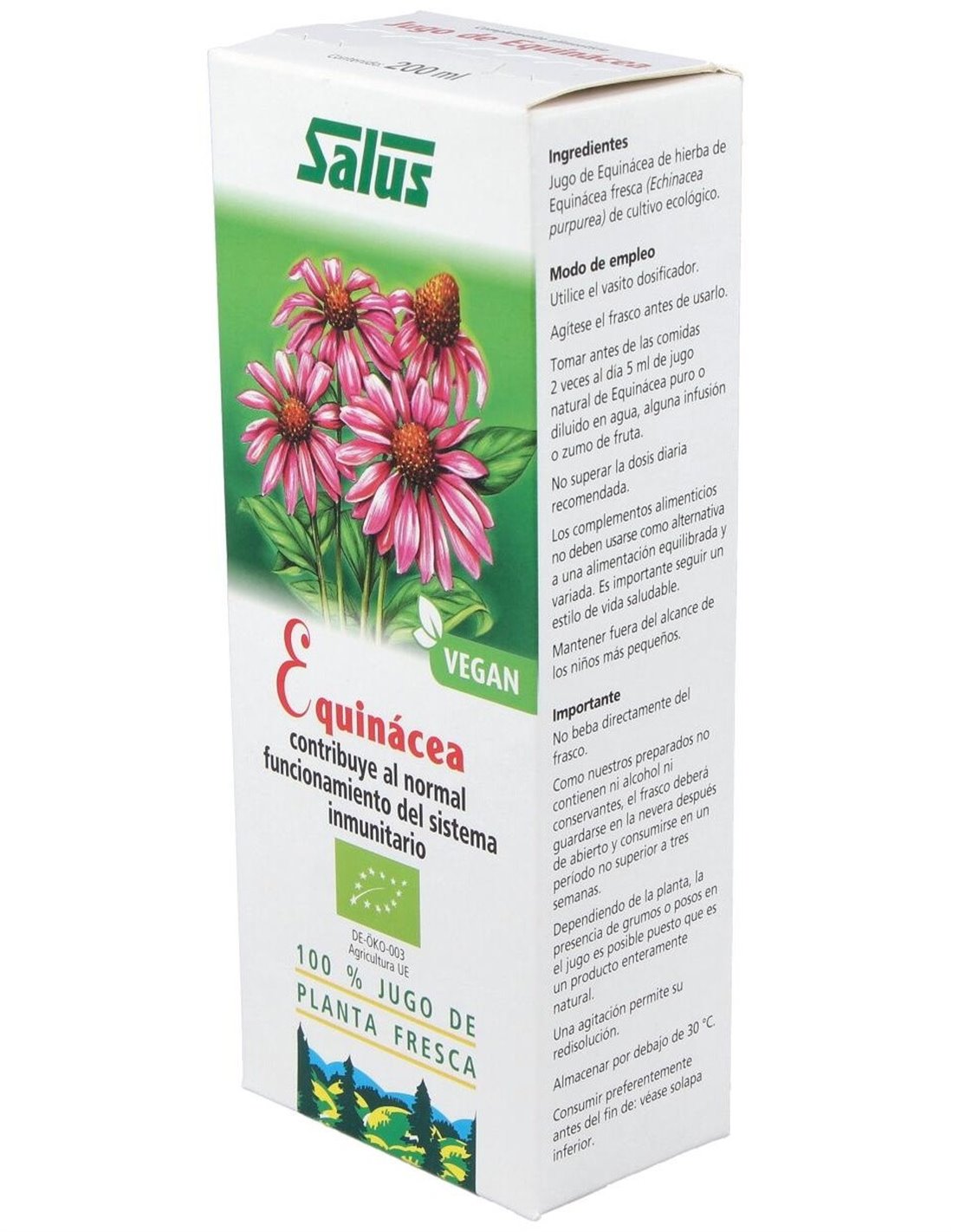 Ingredientes:Jugo natural de planta fresca de hierba floreciente de equinácea de cultivo ecológico. Modo de empleo:Adultos: Tomar antes de las comidas dos veces al día 5 ml de jugo natural de equinácea puro o diluido en agua o en alguna infusión, zumo de fruta o leche.Niños de 10 a 16 años: Tomar antes de las comidas una vez al día 6 ml hasta dos veces al día 4 ml de jugo natral de equinácea puro o diluido en agua o en alguna infusión, zumo de fruta o leche.Niños de 4 a 10 años: Tomar antes de las comidas de dos a tres veces al día 2 ml de jugo natural de equinácea puro o diluido en agua o en alguna infusión, zumo de fruta o leche. Presentación:Frasco de 200 ml.