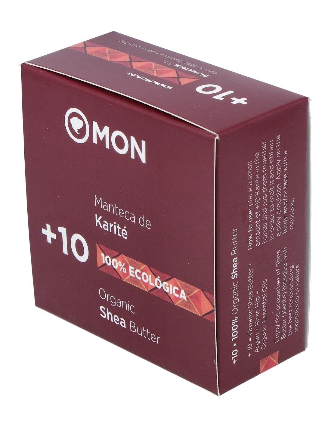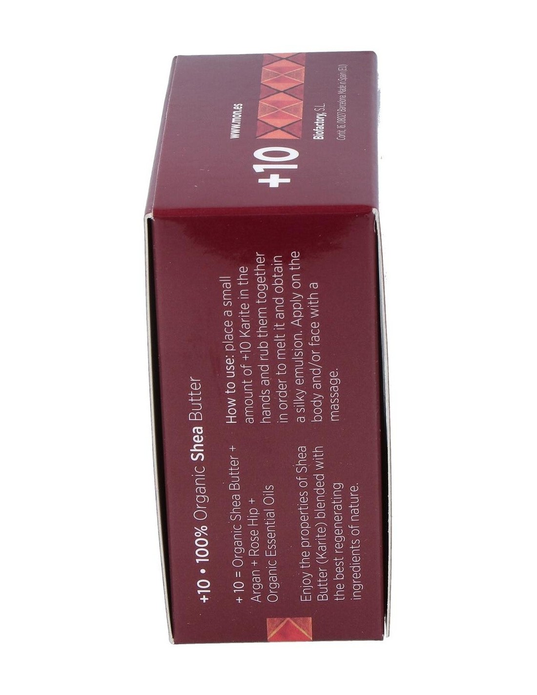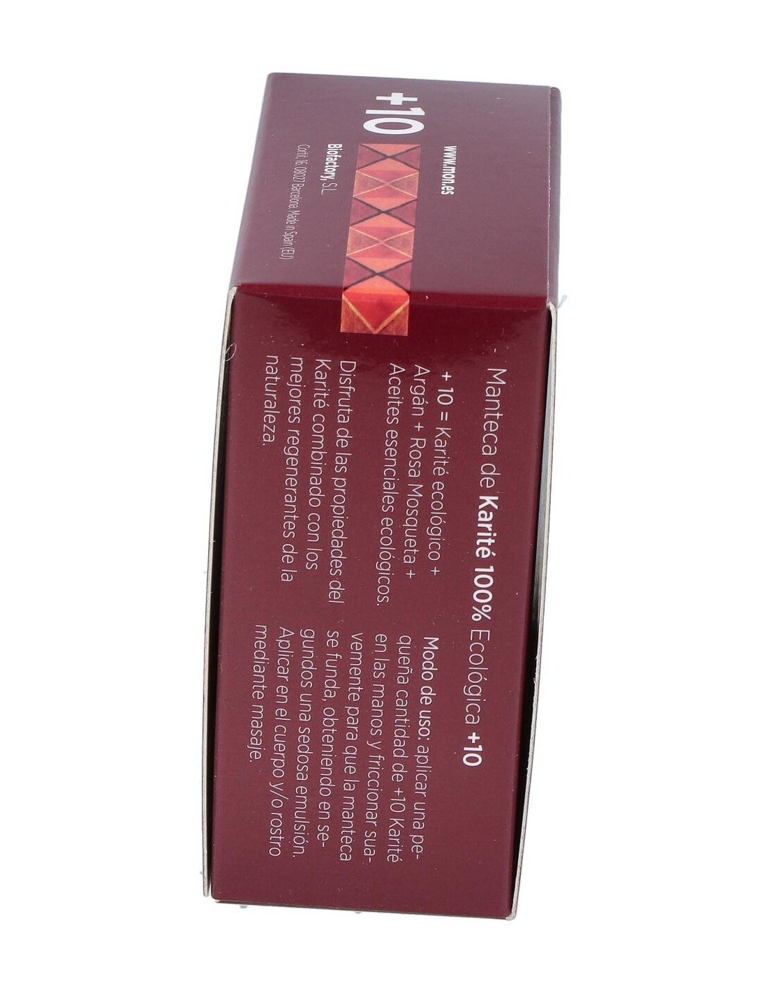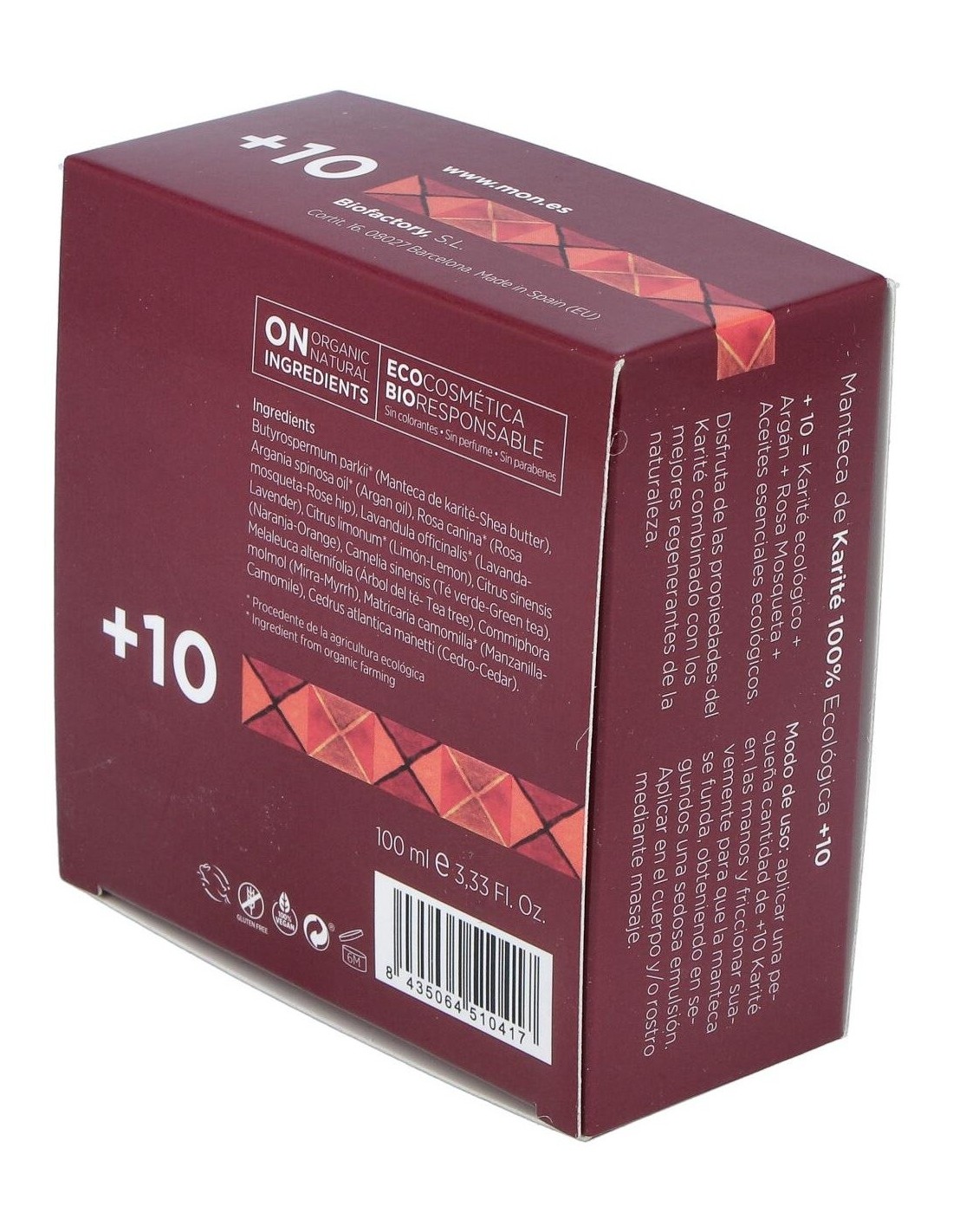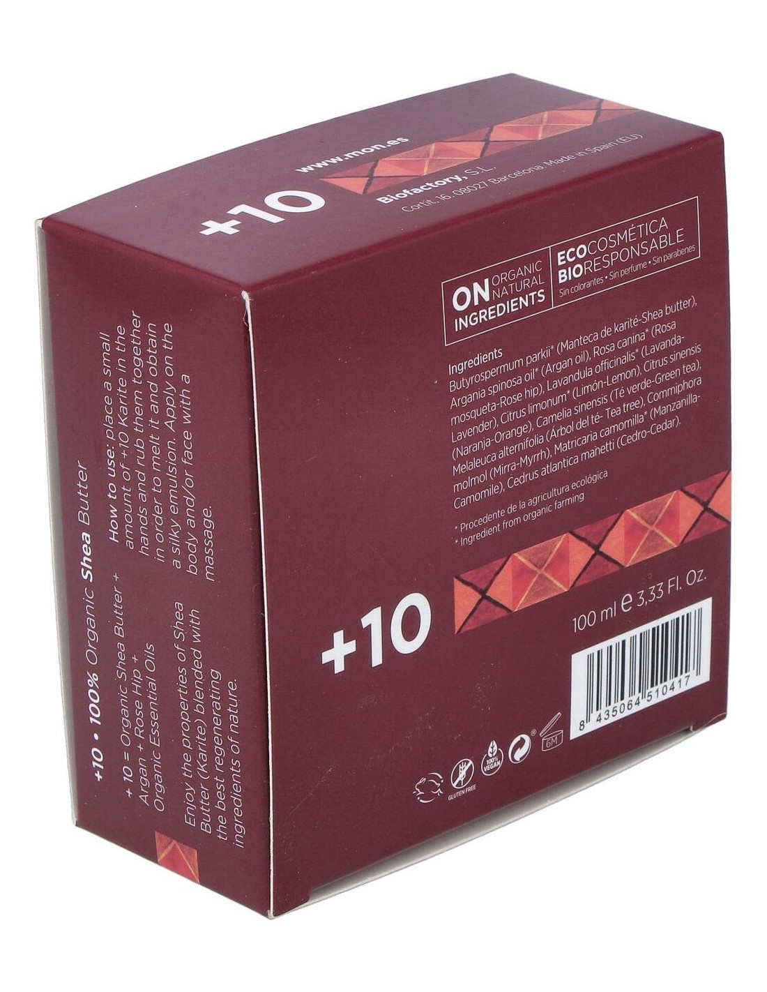La manteca +10 está elaborada sólo y exclusivamente con Karité ecológico, aceite de Argán, aceite puro de Rosa Mosqueta y aceites esenciales de Lavanda, Limón, Naranja, Sándalo, Té Verde, Mirra y Manzanilla, procedentes de la agricultura ecológica.