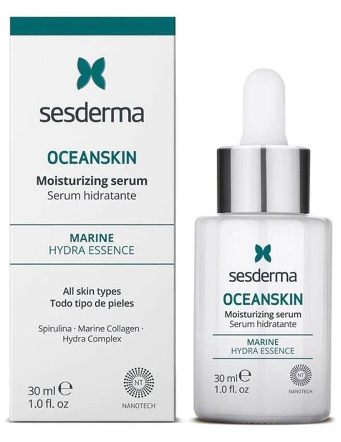 Sesderma Oceanskin Serum Hidratante 30 mles un sérum hidratante indicado para cuidar las pieles secas o reactivas, así como para contrarrestar los efectos del envejecimiento de la piel. Contiene activos marinos para una hidratación de la piel, como la espirulina, el colágeno marino, las algas marinas y el extracto de caviar, así como el exclusivo Ses Hydra Complex, compuesto por mantecas y aceites naturales.