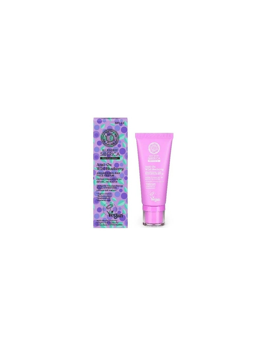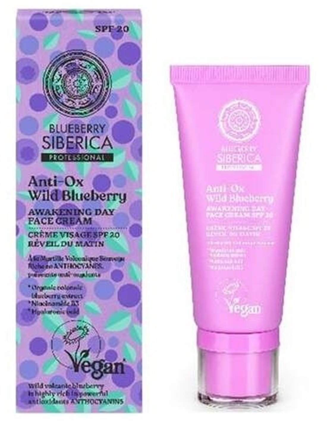 NATURA SIBERICAEsta crema facial de día con SPF20 hidrata la piel en profundidad y minimiza los factores ambientales adversos. El ácido hialurónico hidrata intensamente la piel y previene la aparición de finas arrugas. La niacinamida B3 unifica el tono de la piel y le devuelve su esplendor natural día tras día. Los antioxidantes de la baya de arándano y la vitamina B3 combaten la oxidación de la piel y previenen su envejecimiento. Cosmético vegano.