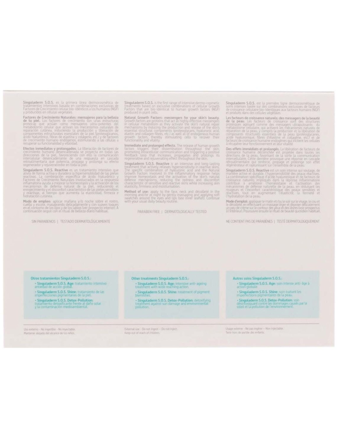 SINGULADERMLa combinación específica de ácido hialurónico de bajo peso molecular y Factores de Crecimiento Naturales involucrados en la respuesta inflamatoria ayuda a mejorar la homeostasis y la activación de los mecanismos de defensa natural de la piel.\ Indicado para pieles reactivas o con sensibilidad cutánea (natural o adquirida). Primera línea dermocosmética de tratamientos intensivos basados en combinaciones exclusivas de Factores de Crecimiento celular bio-idénticos a los humanos (NGF) producidos en células vegetales. Todo tipo de pieles. Testado dermatológicamente.