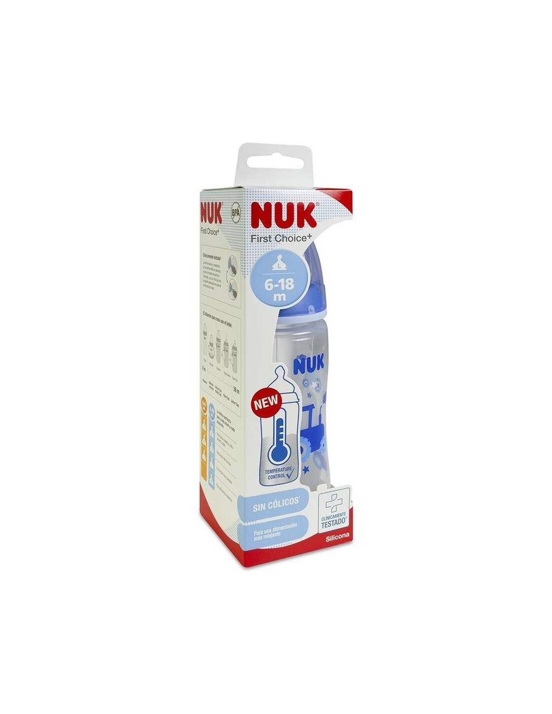 NUKNo contiene sustancias nocivas; sin olor y sin BPA.\ Cuello ancho para facilitar el llenado y la limpieza.\ Tetina de silicona con forma anatómica exclusiva que se adapta perfectamente a la mandíbula del bebé, de 6-18 meses, L (orificio grande = alimentos espesos).\ Con sistema de ventilación NUK ANTI-COLIC AIR SYSTEM mejorado que ayuda a prevenir los cólicos.\ Incluye anillo de rosca, disco de cierre y tapa protectora.