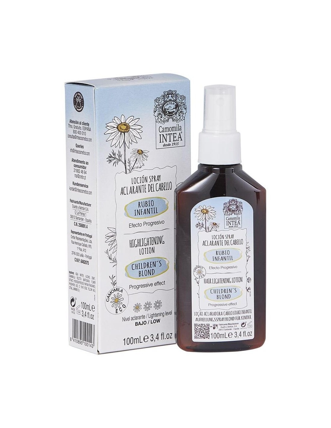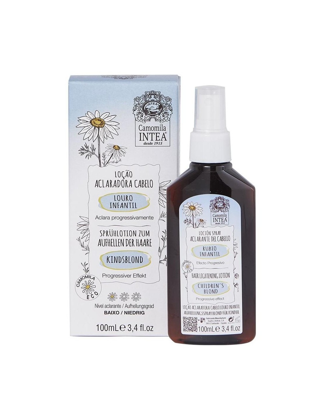 Intea Camomila Loción Aclarante Rubio Infantil 100ml es un spray con extracto natural ECO de flores de camomila, que ayuda a aclarar el delicado cabello castaño o rubio oscuro de los más pequeños.No es un tinte.