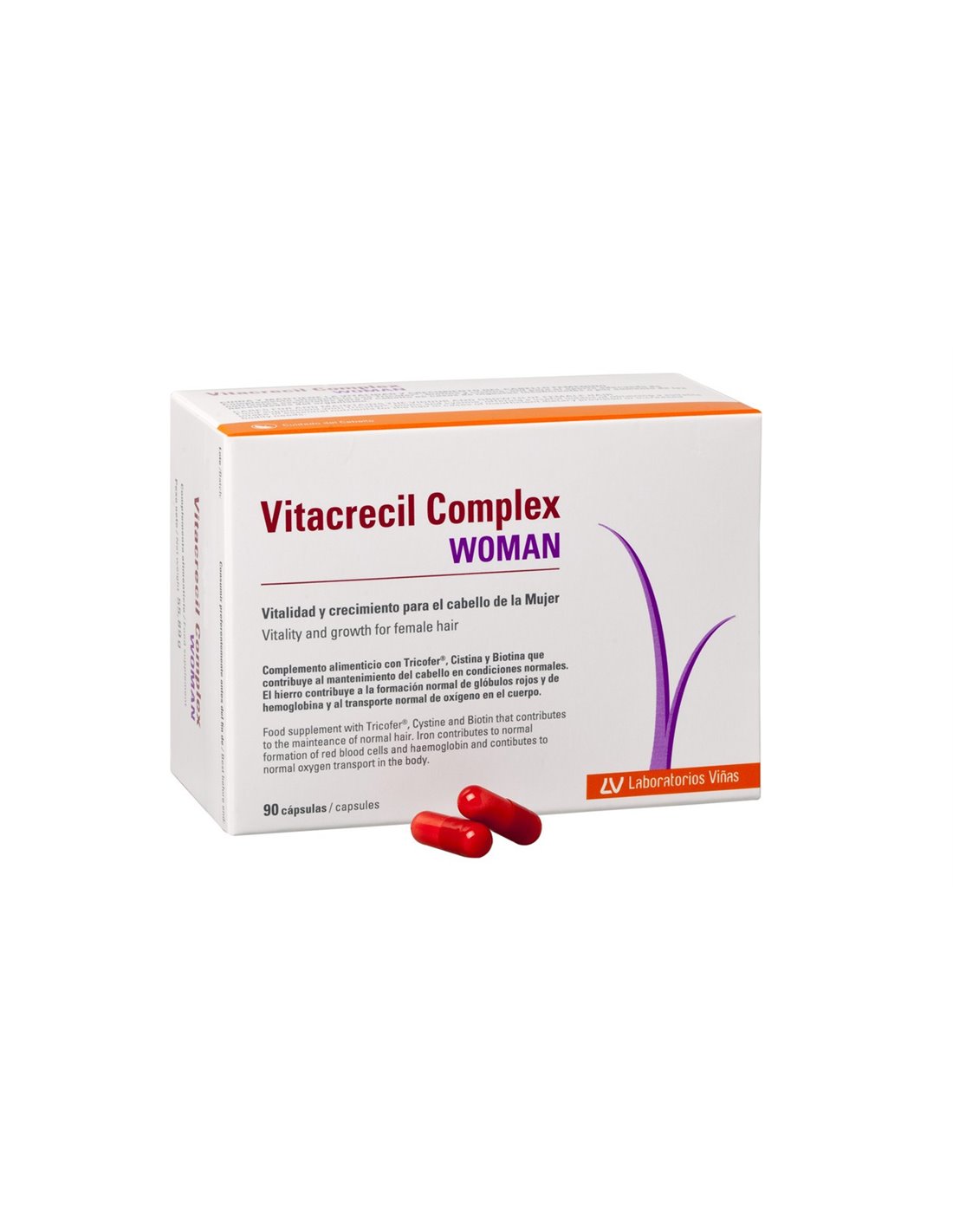 VITACRECILVitacrecil Complex Woman es un complemento alimenticio con hierro (Tricofer®), cistina y biotina, combinación de nutrientes esenciales específicamente diseñada para la vitalidad, el crecimiento y el metabolismo del cabello, especialmente útil para situaciones de déficits nutricionales que afecten el cabello de la mujer. El hierro (Tricofer®) contenido en Vitacrecil Complex Woman representa una fuente de hierro con una elevada biodisponibilidad que permite mejorar su tolerabilidad gastrointestinal evitando algunos efectos que pueden asociarse a la ingesta de este nutriente, como molestias estomacales o intestinales o coloración de las heces y mucosas. El hierro es un elemento esencial que contribuye a la formación normal de glóbulos rojos y de hemoglobina y al transporte normal de oxígeno en el cuerpo. La biotina es una vitamina cuyo aporte dietético suficiente contribuye al mantenimiento del cabello en condiciones normales. La cistina es un aminoácido azufrado constitutivo de la queratina.
