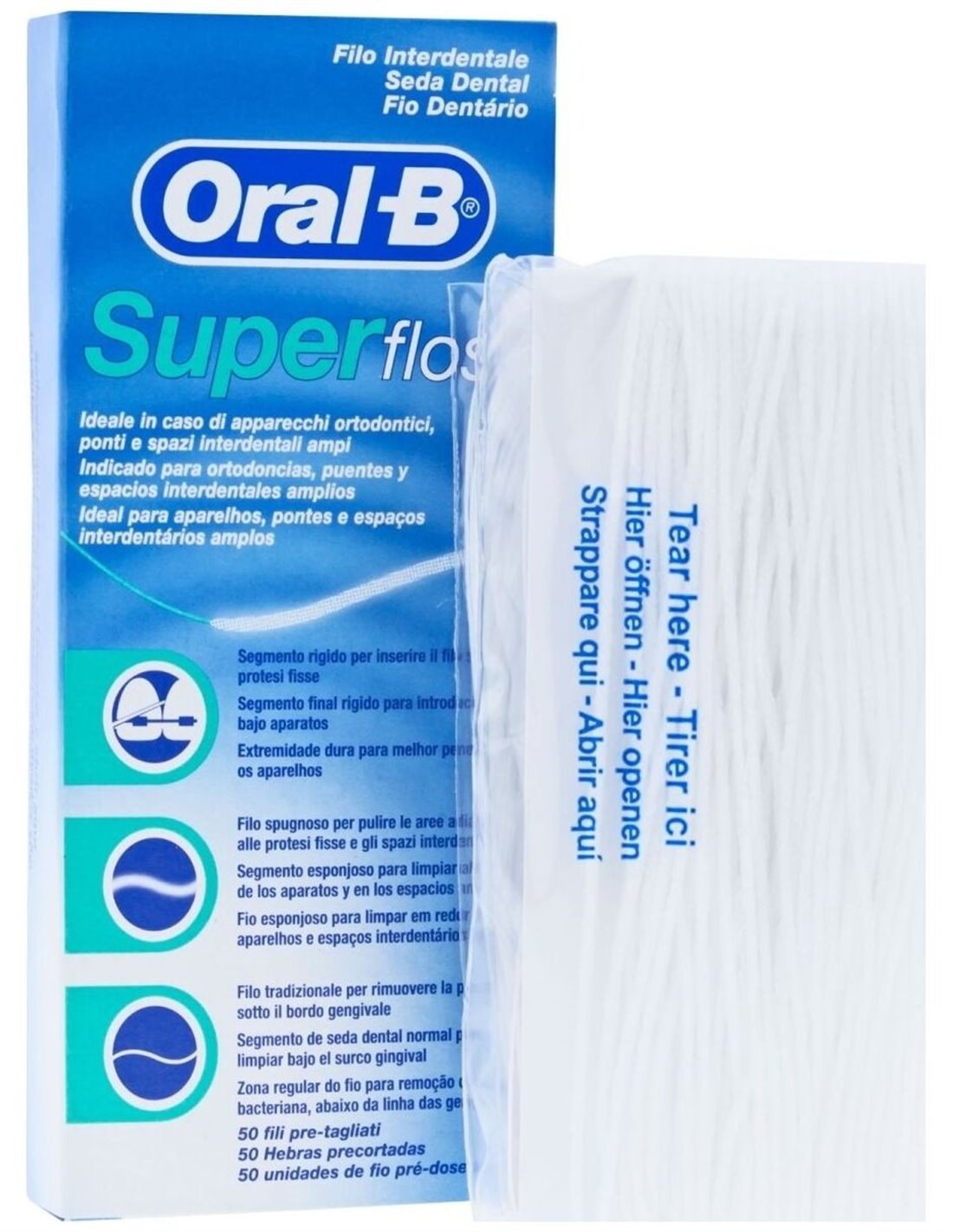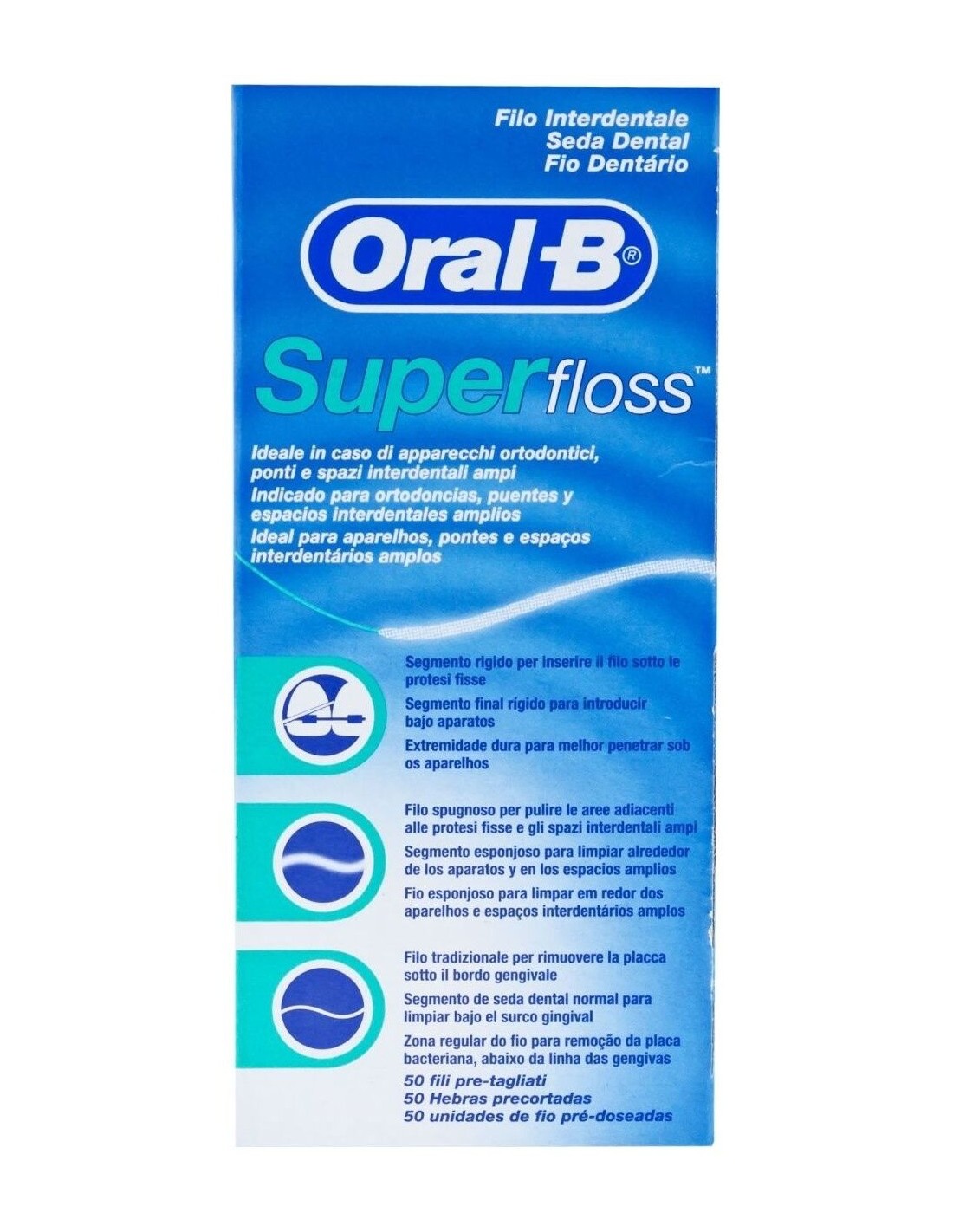 "DescripciónOral-B | Oral-B Super Floss seda dental 50 hilosLa seda dental Oral-B Super Floss aporta una solución suave y eficaz para facilitar la limpieza de los aparatos dentales, al facilitar la inserción bajo puentes y ortodoncia.Sus extremos son rígidos y su contenido esponjoso, favoreciendo así una higiene bucal respetuosa con la estabilidad de los dientes y de las encías.