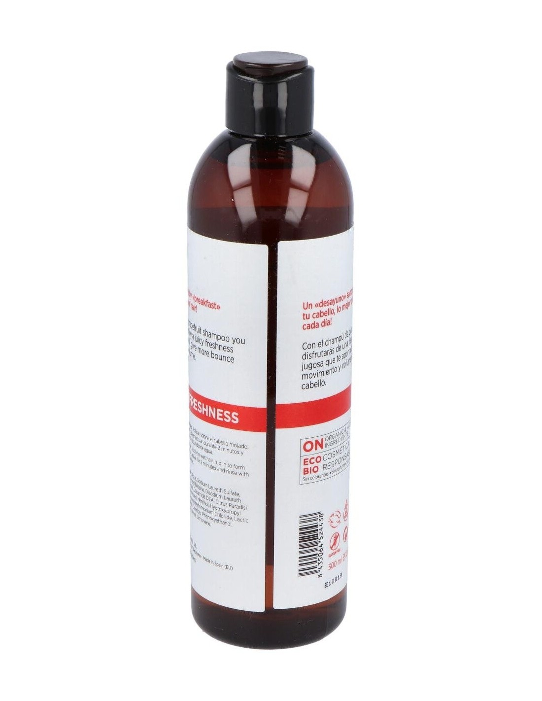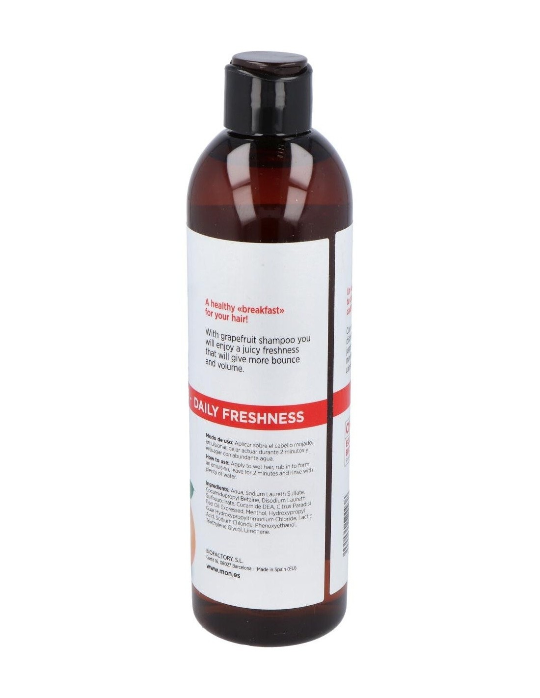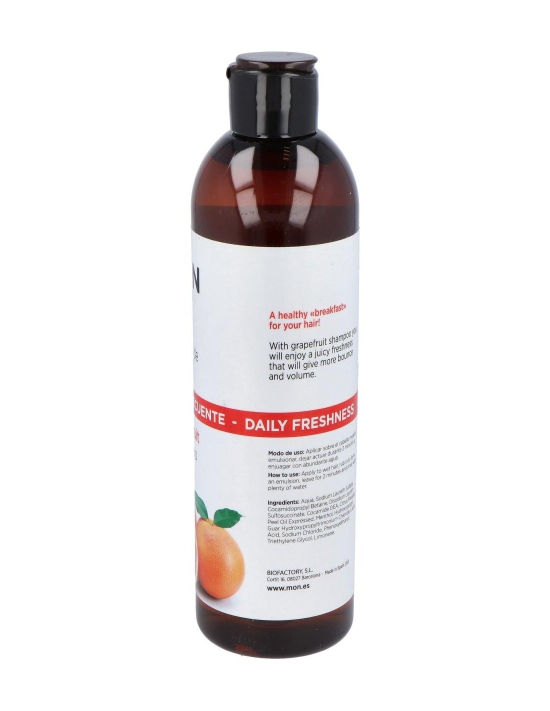 - Contiene extracto de pomelo, conocido por sus propiedades refrescantes que ayudan a revitalizar el cuero cabelludo.