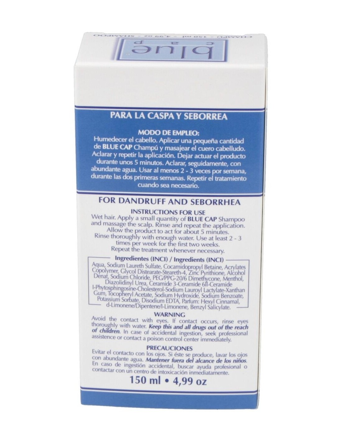 Indicado para el cuidado del cuero cabelludo afectado por caspa, seborrea seca o seborrea grasa. En el caso de la caspa, disminuye el picor y la descamación. Normaliza la actividad de las células del cuero cabelludo y tiene una influencia positiva sobre el crecimiento del cabello. Indicado como complemento del Blue Cap Loción. Para la seborrea seca, se recomienda que el uso sea mixto mediante la aplicación de loción y champú. Para la seborrea grasa, bastará con la aplicación del champú.