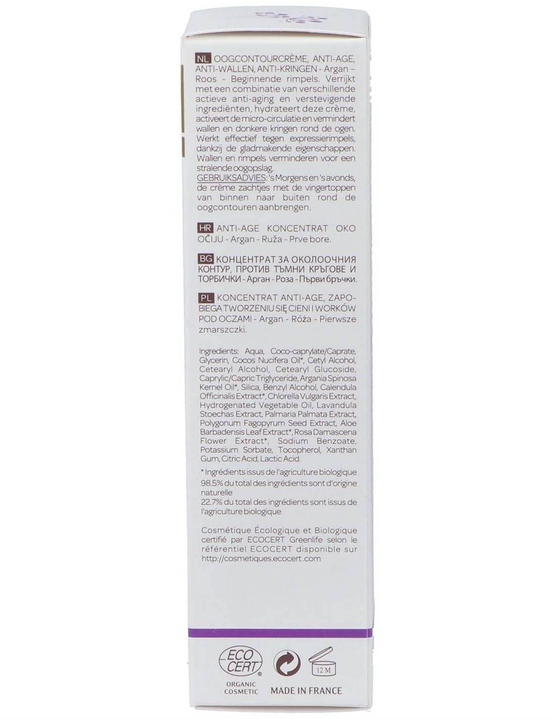 El producto está elaborado con ingredientes de origen natural, respetando la sensibilidad de la piel alrededor de los ojos. Su textura cremosa y ligera permite una aplicación uniforme, ideal para usar tanto en la mañana como en la noche. Además, su presentación en un envase compacto facilita su transporte y almacenamiento.