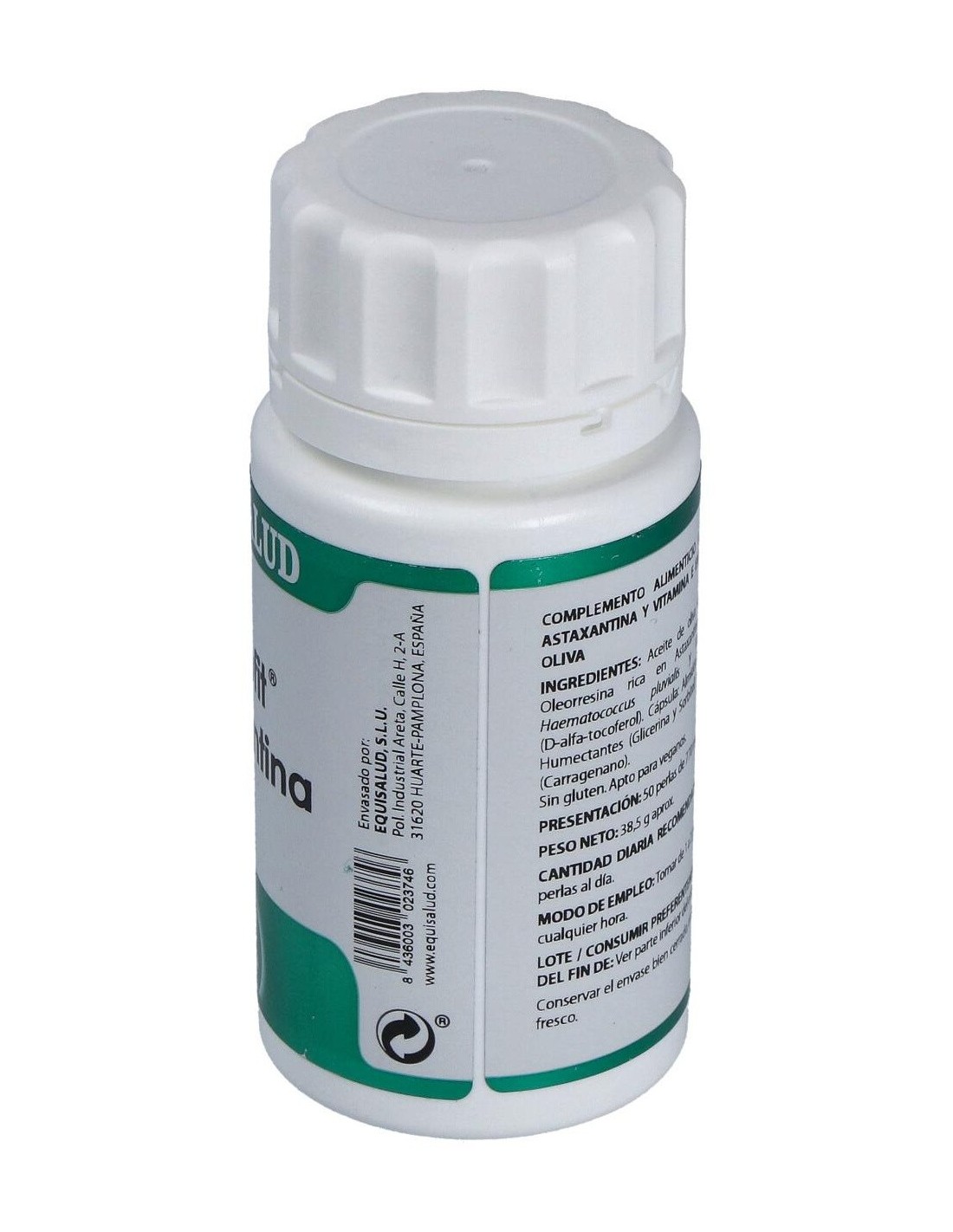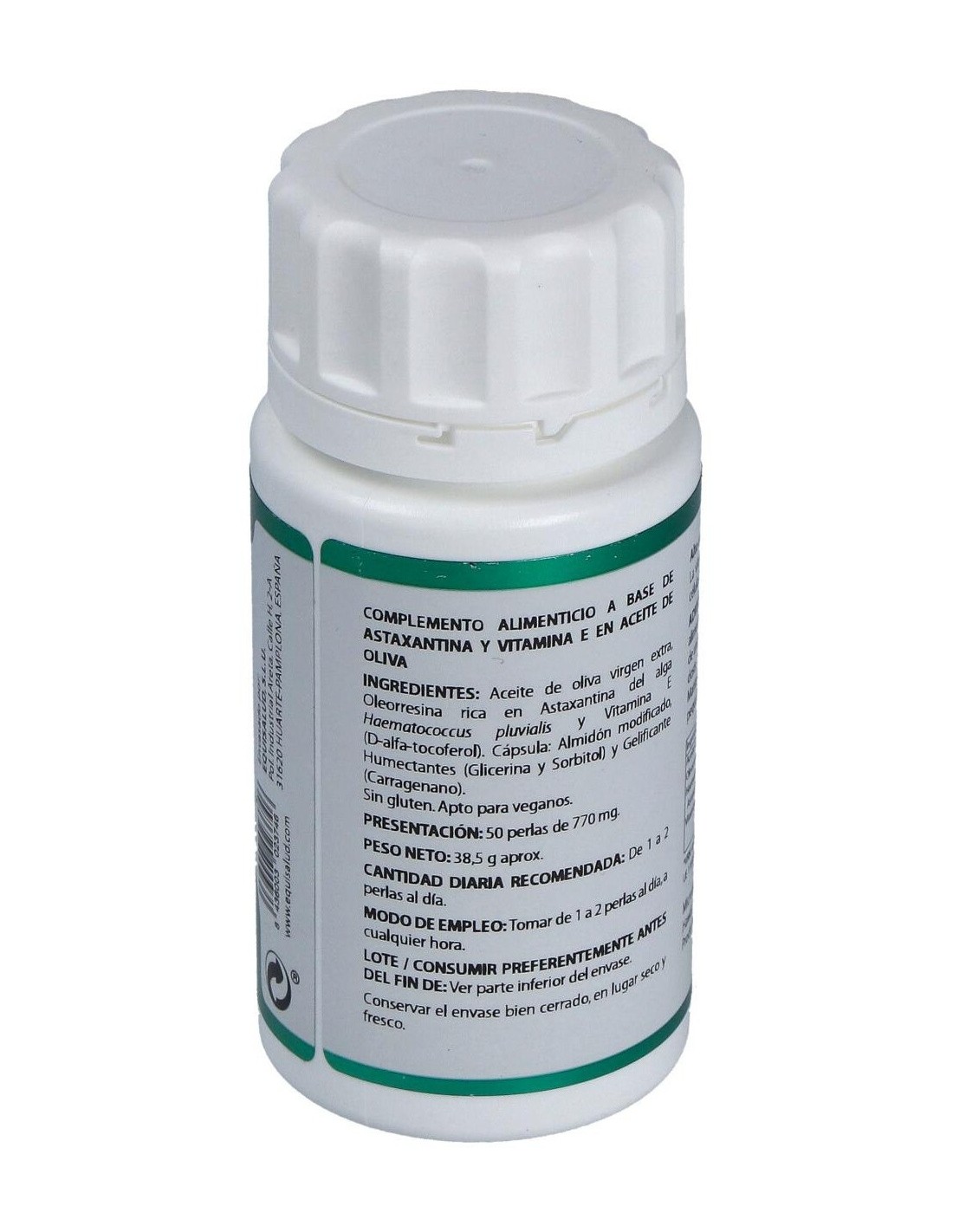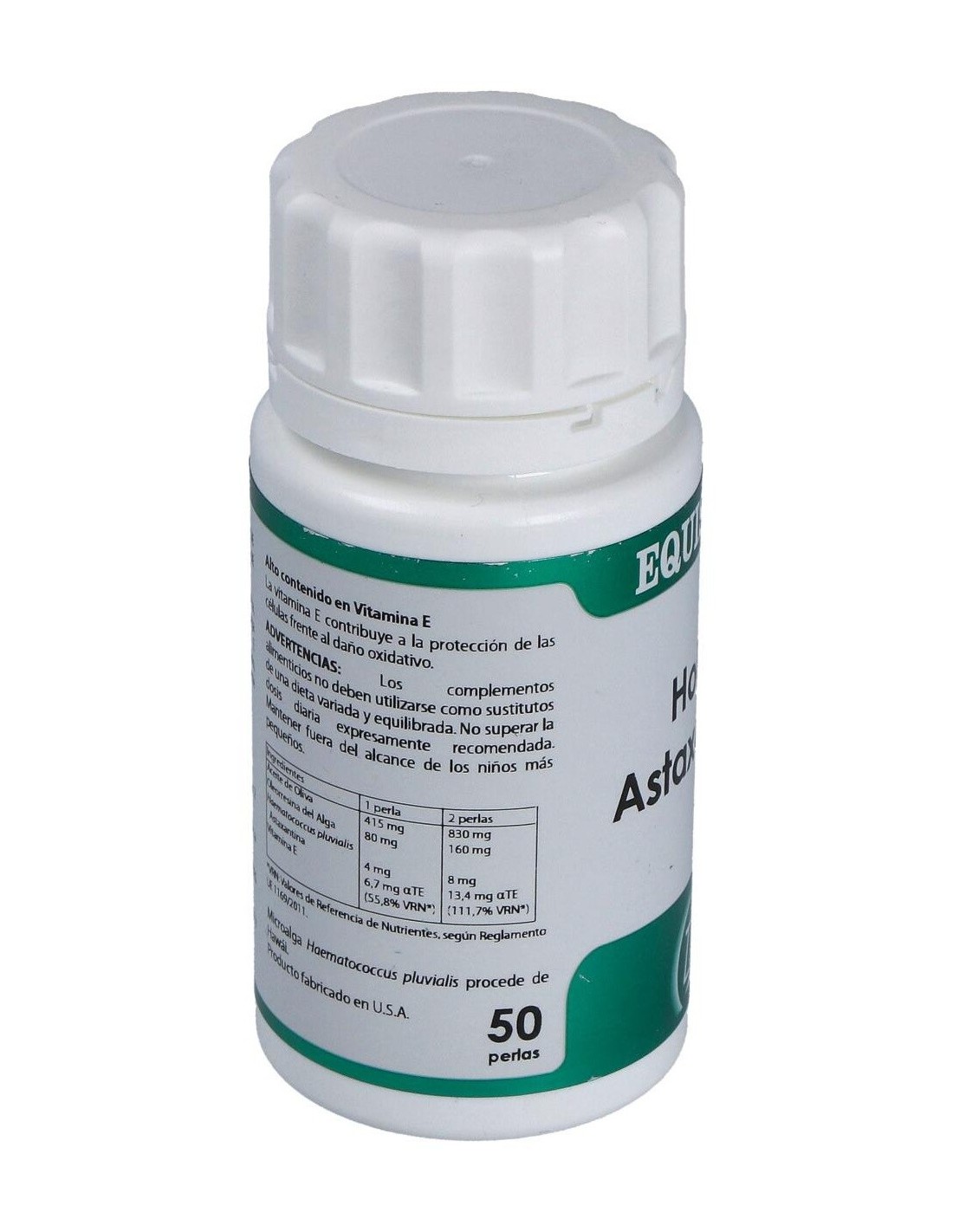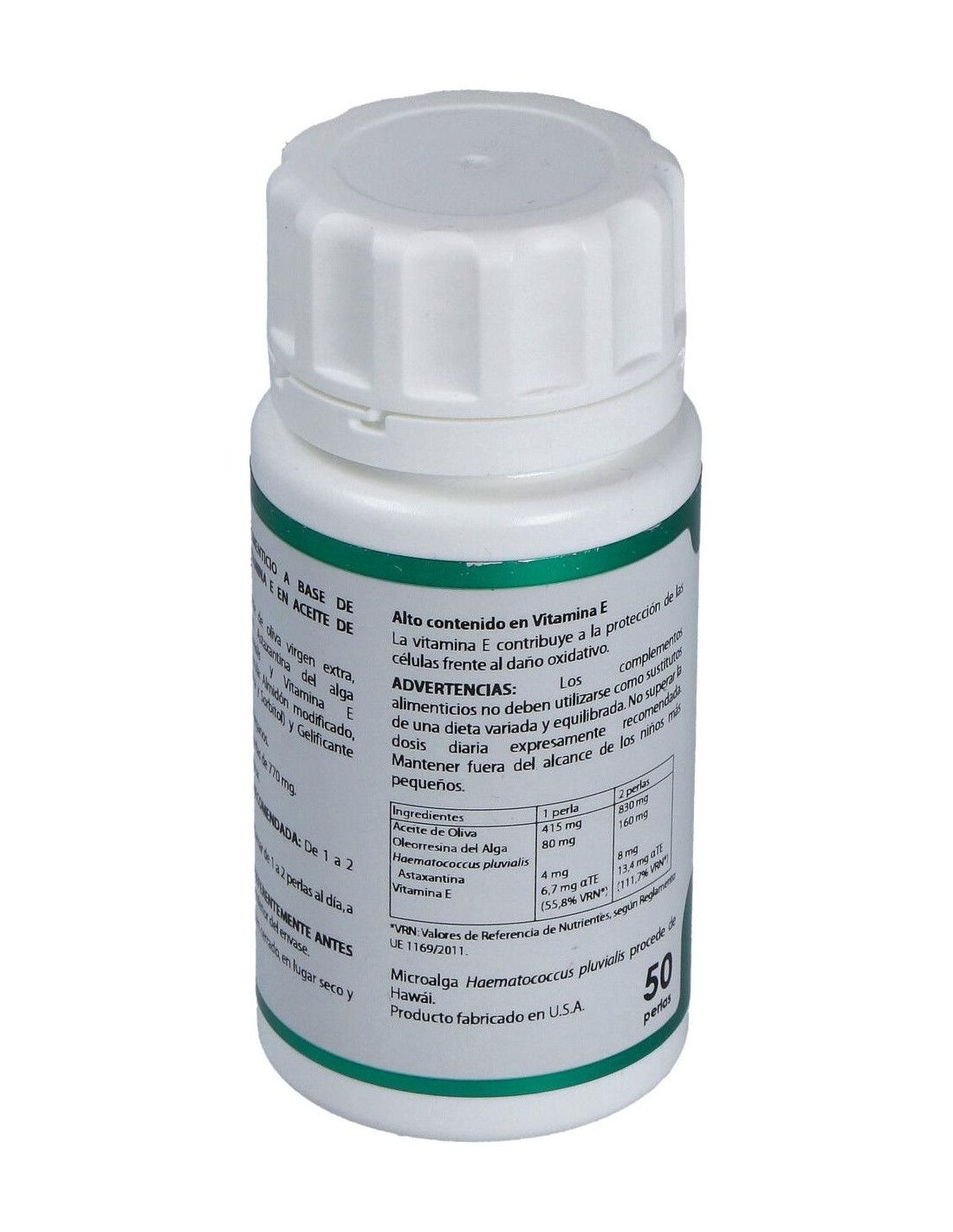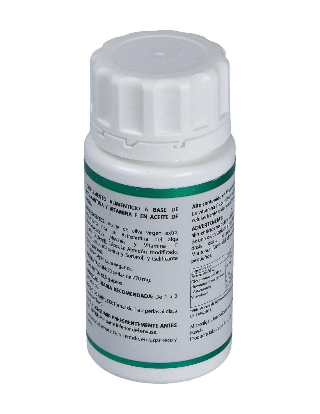 50 mg de extracto del microalga Haematococcus pluvialis (4 mg astaxantina, 40 µg de luteína, 64 µg de betacaroteno, 72 µg de cataxantina).