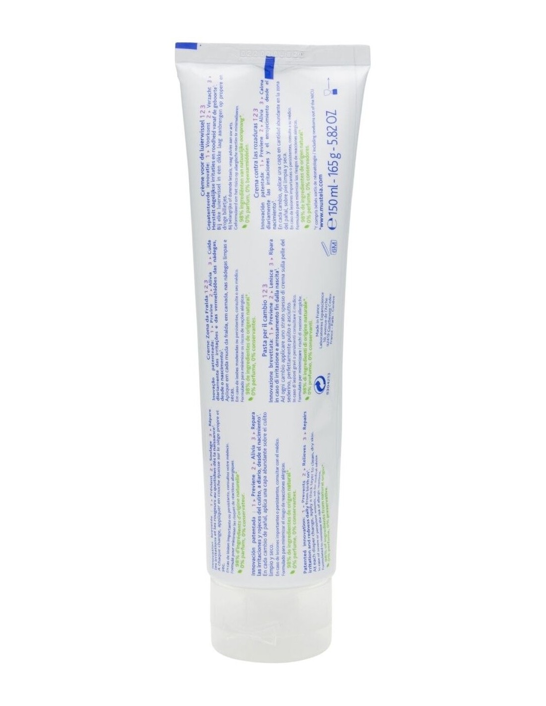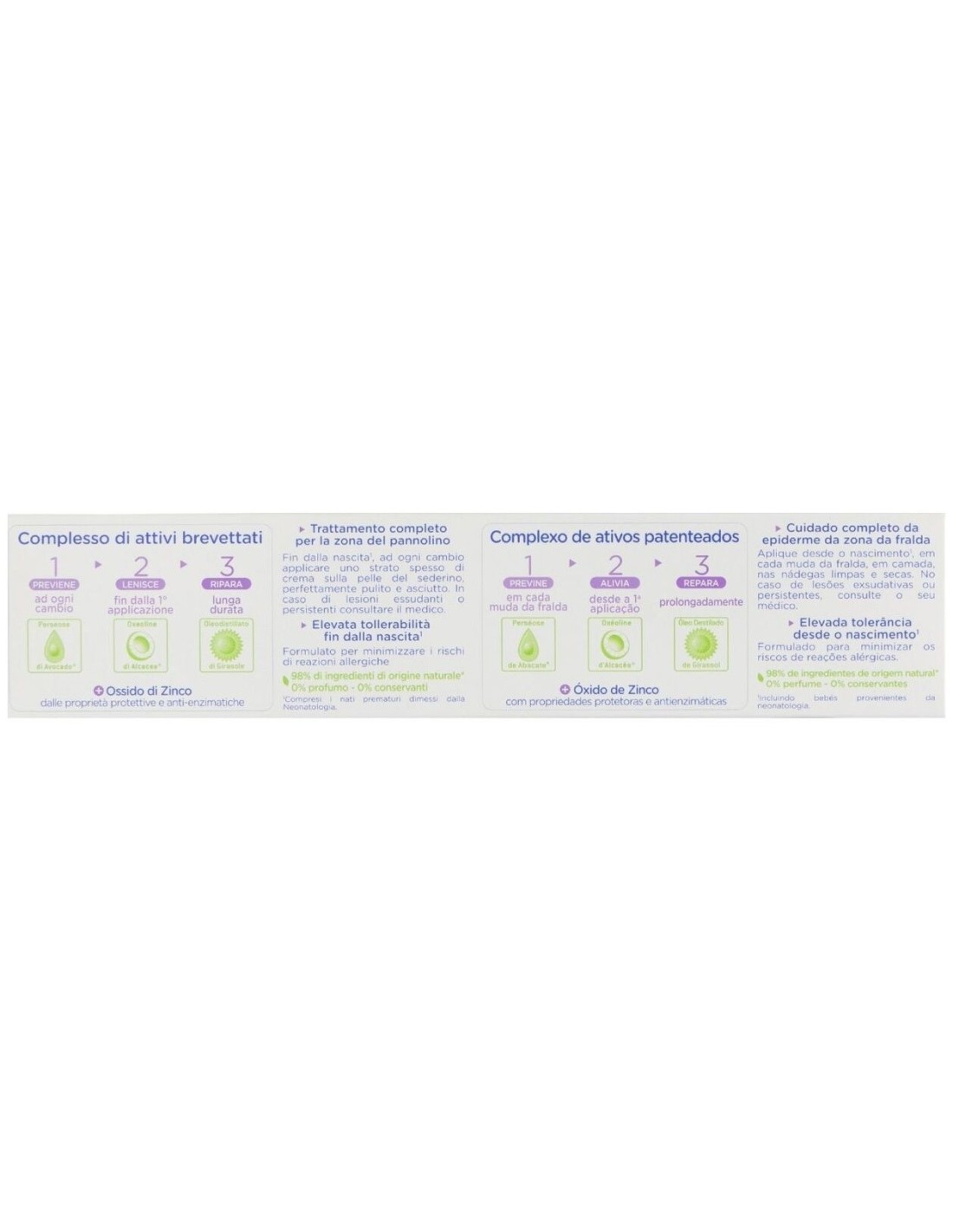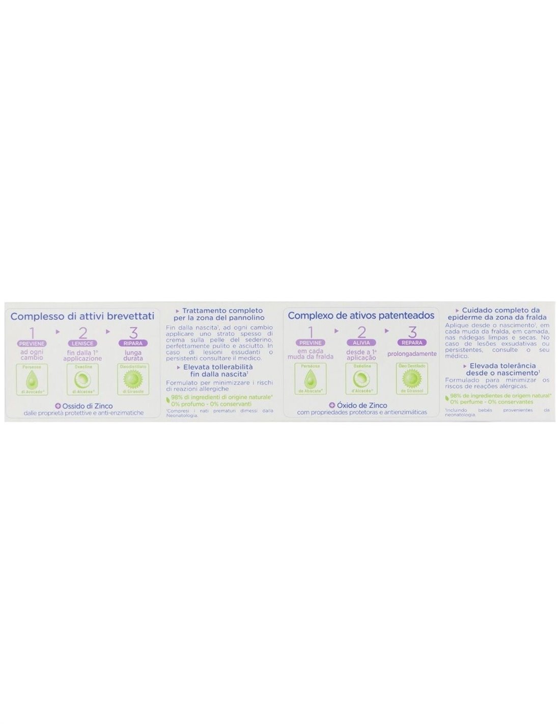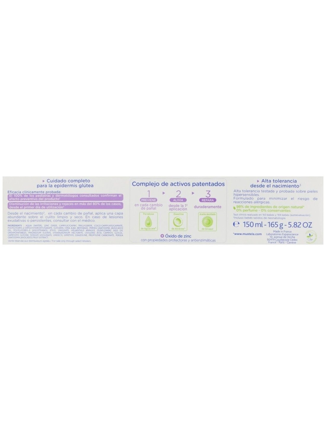 Ingredientes (INCI):Aqua (Water), Zinc Oxide, Caprylic/Capric Triglyceride, Coco-Caprylate/Caprate, Polyglyceryl-2-Dipolyhydroxystearate, Glycerin, Cera Alba (Beeswax), Persea Gratissima (Avocado) Oil, Polyglyceryl-3 Diisostearate, Ethyl Linoleate, Helianthus Annuus (Sunflower) Seed Oil Unsaponifiables, Magnesium Sulfate, Stearalkonium Hectorite, Levulinic Acid, Caprylyl Glycol, Capryloyl Glycine, Sodium Levulinate, Undecyl Dimethyl Oxazoline, Propylene Carbonate, Persea Gratissima (Avocado) Fruit Extract.98% de ingredientes de origen natural. El 2% restante permite obtener una textura agradable y proteger a largo plazo la fórmula.Modo de empleo:Puede usarse en cualquier circunstancia, incluso en caso de diarrea y en periodo de dentición.