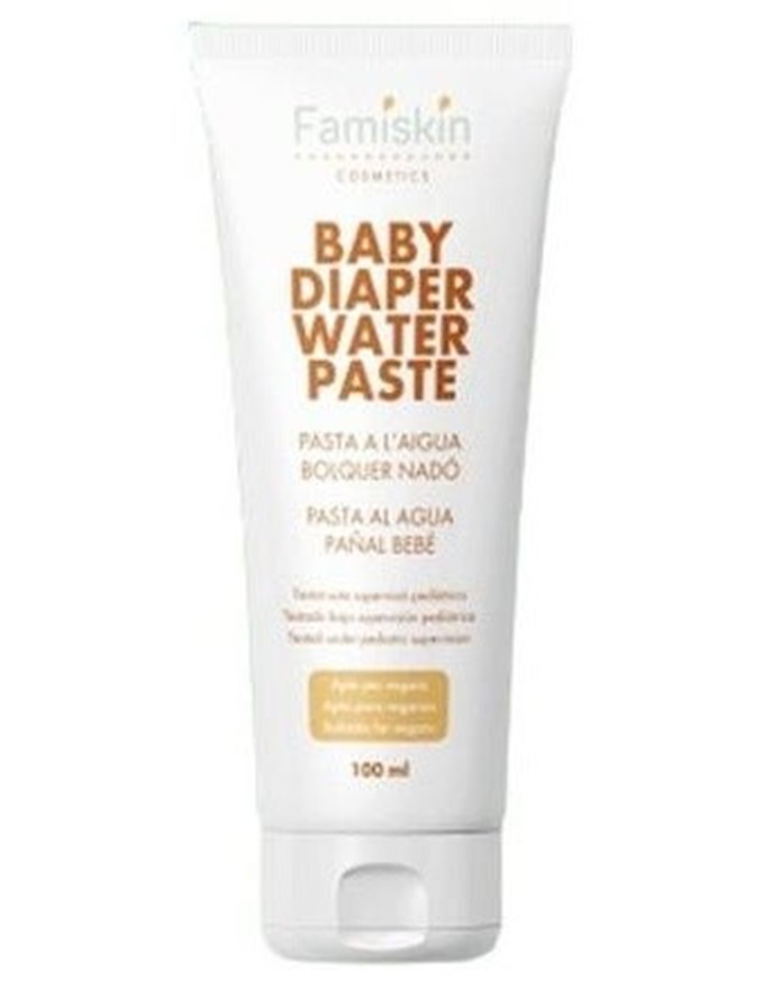 FAMISKINPasta al agua pañal bebé con óxido de zinc, pantenol, aceite de caléndula, aceite de semilla de algodón. Protege la piel del culito contra las irritaciones, enrojecimientos y la humedad. Calma e hidrata. Apto para veganos. Testado bajo supervisión pediátrica. +99% ingredientes naturales.