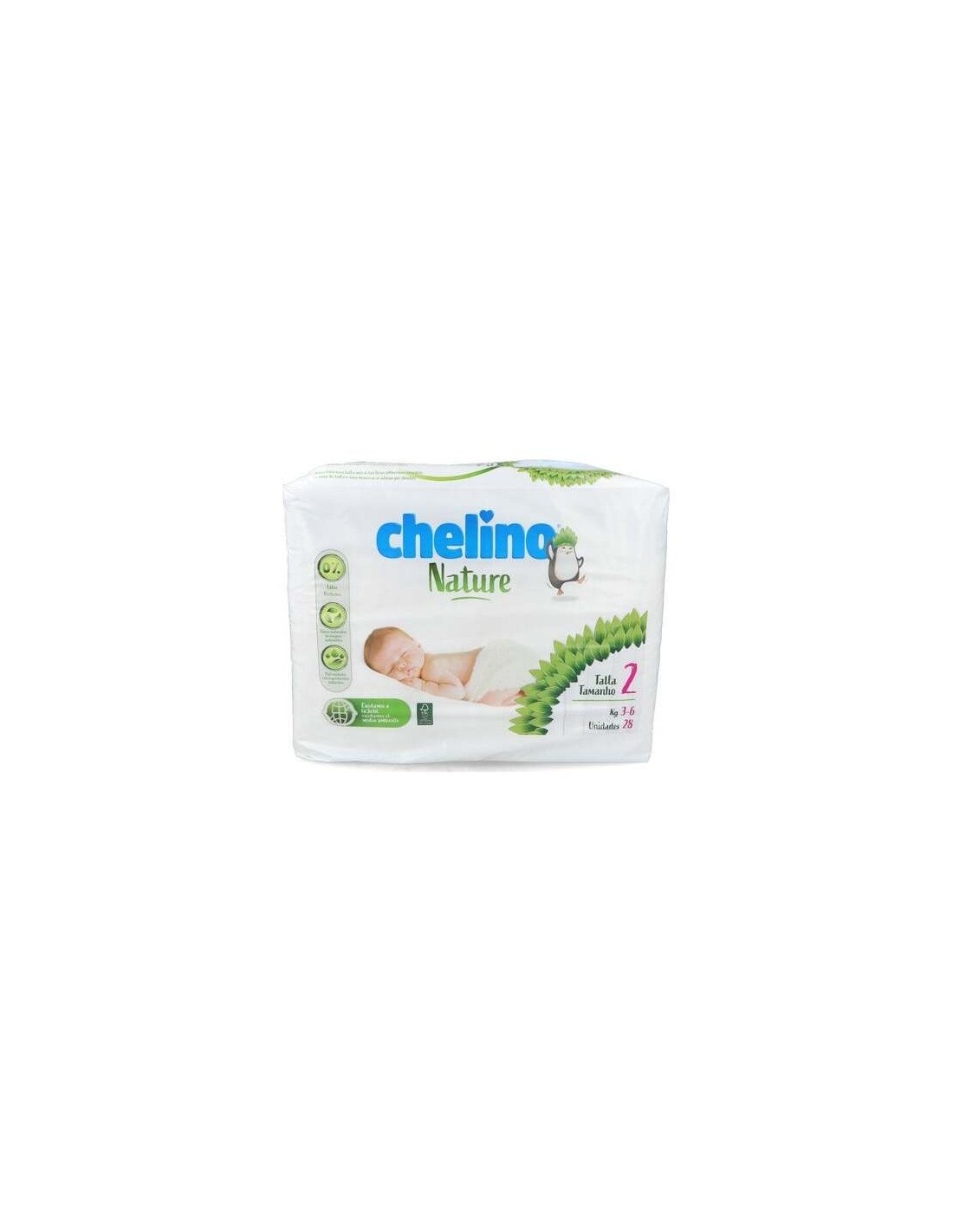 CHELINOLos pañales Chelino Nature®, cuidan tanto del bebé como del medio ambiente. La talla 2 está diseñada para bebés con un peso comprendido entre 3 y 6 kilos. 0% Látex, perfumes. Fibras naturales de bosques sostenibles. Piel cuidada con ingredientes naturales. Celulosa proviniente de bosques sostenibles y gestionados de manera responsable. Hasta 24 horas seco.