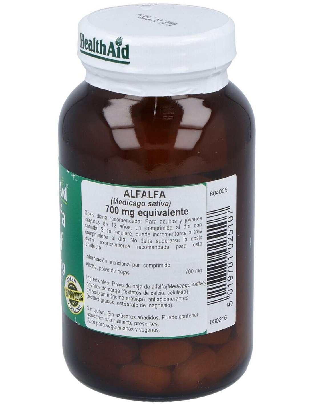 Alfalfa Leaf 700Mg. 120Comp. Health Aid de Health Aid es un suplemento diseñado para personas que buscan complementar su dieta con ingredientes naturales derivados de la alfalfa. Este producto es adecuado para quienes desean incorporar una fuente vegetal concentrada en su rutina diaria.