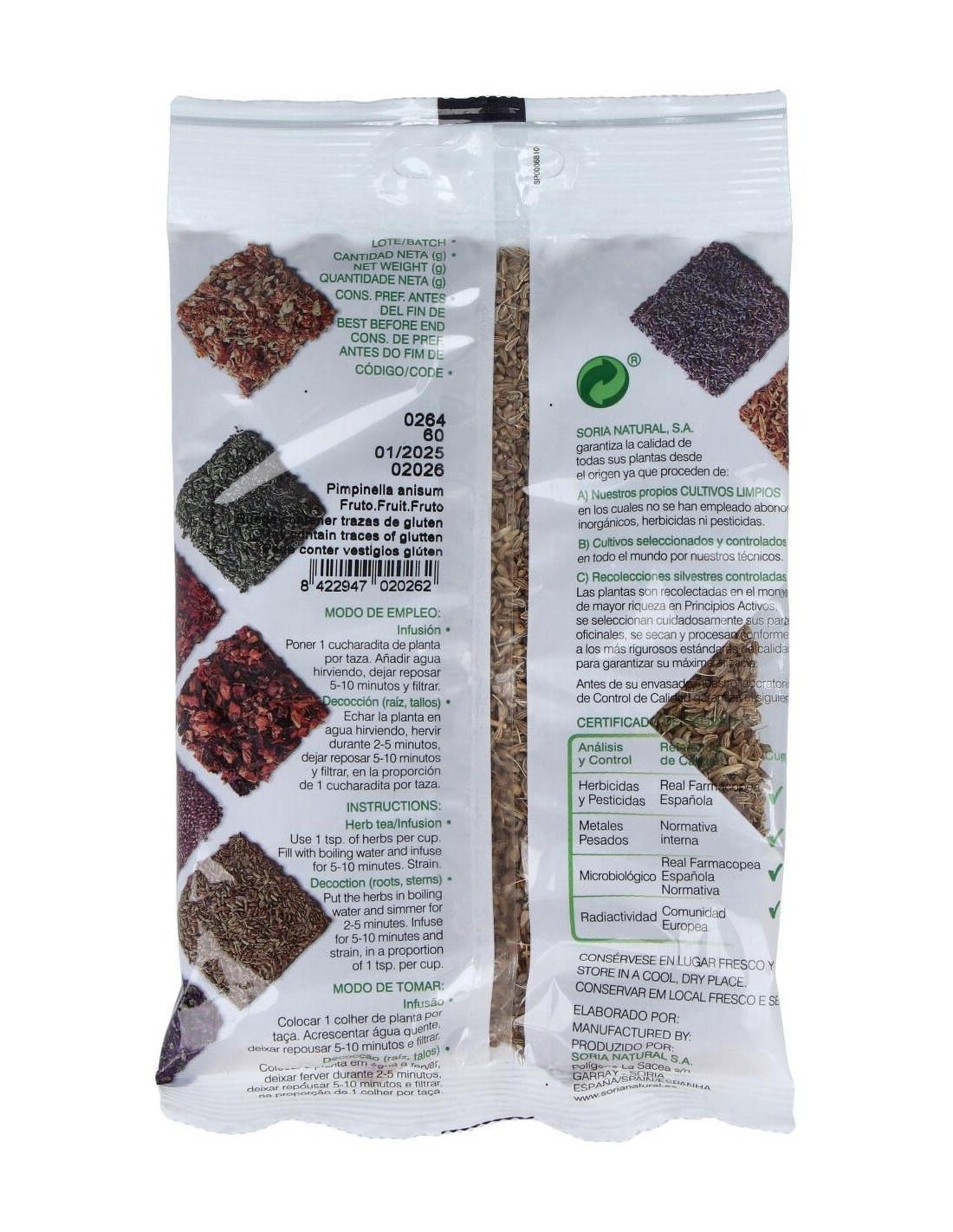 El anís verde de Soria Natural se presenta en una bolsa práctica que protege el contenido de la humedad y la luz, manteniendo sus propiedades durante más tiempo. Su origen natural y proceso cuidadoso aseguran un producto apto para diferentes aplicaciones culinarias y de infusión.