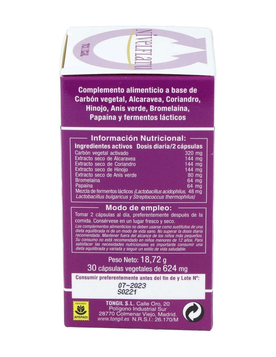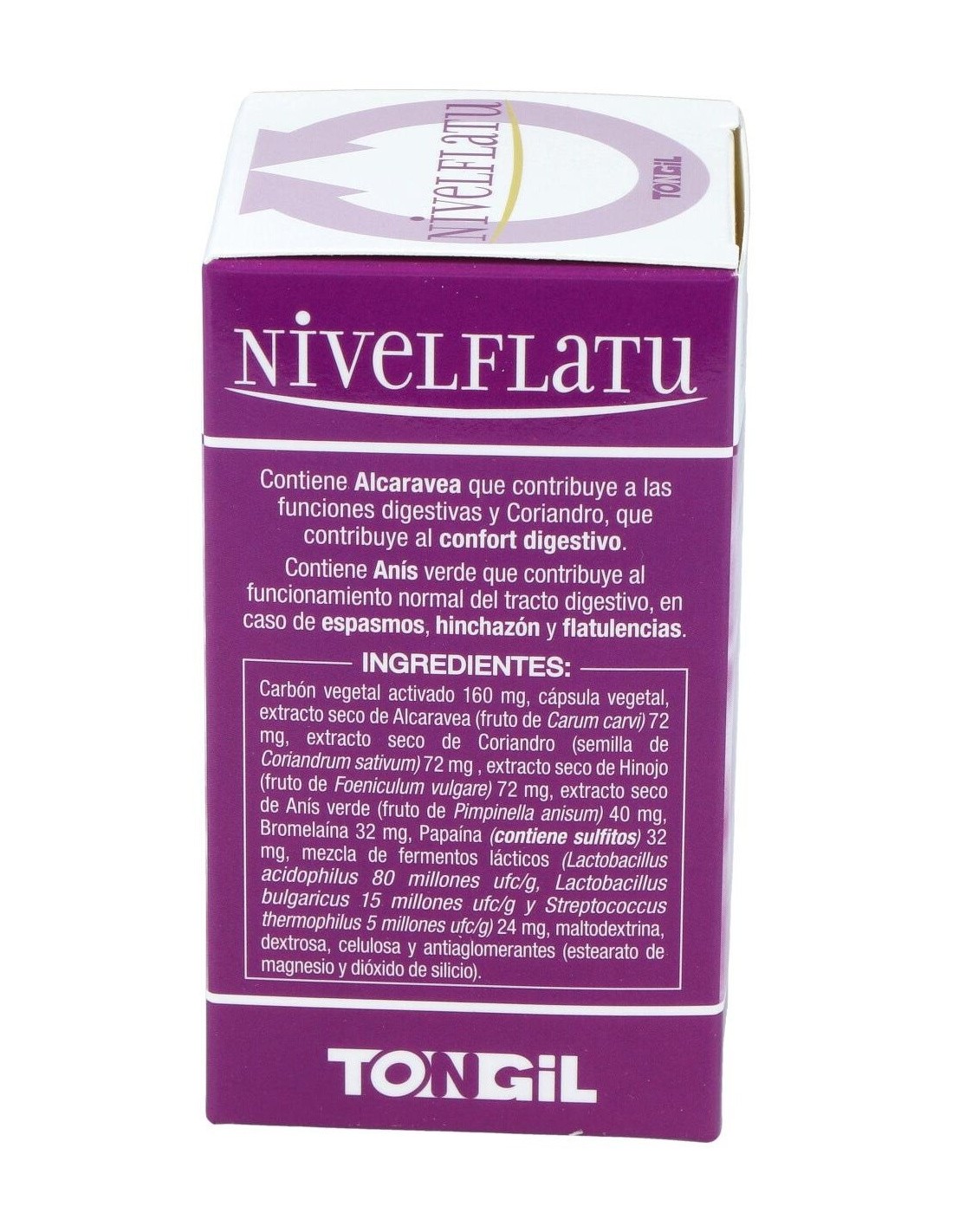 Complemento alimenticio a base de Carbón vegetal, Alcaravea, Coriandro, Hinojo, Anís Verde, Bromelaína, Papaína y Fermentos Lácticos.
