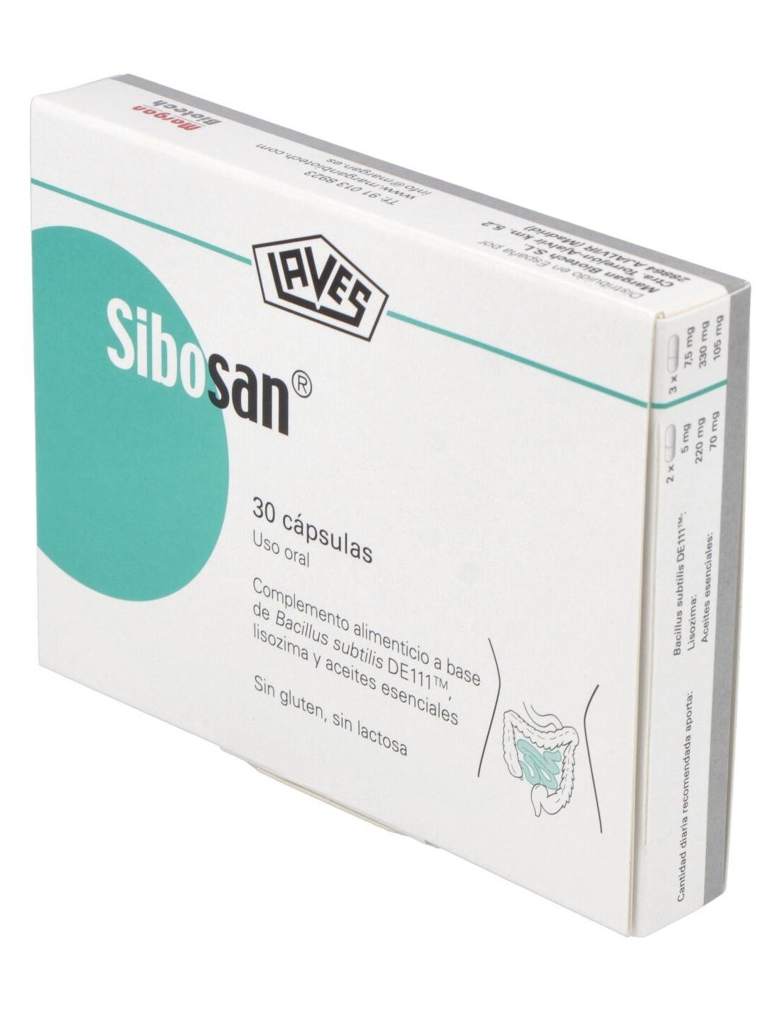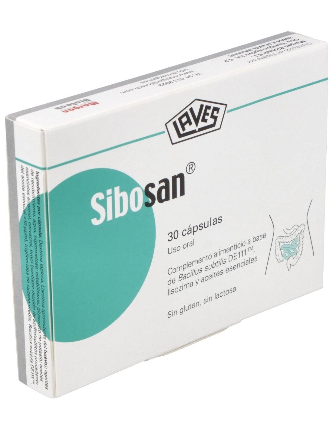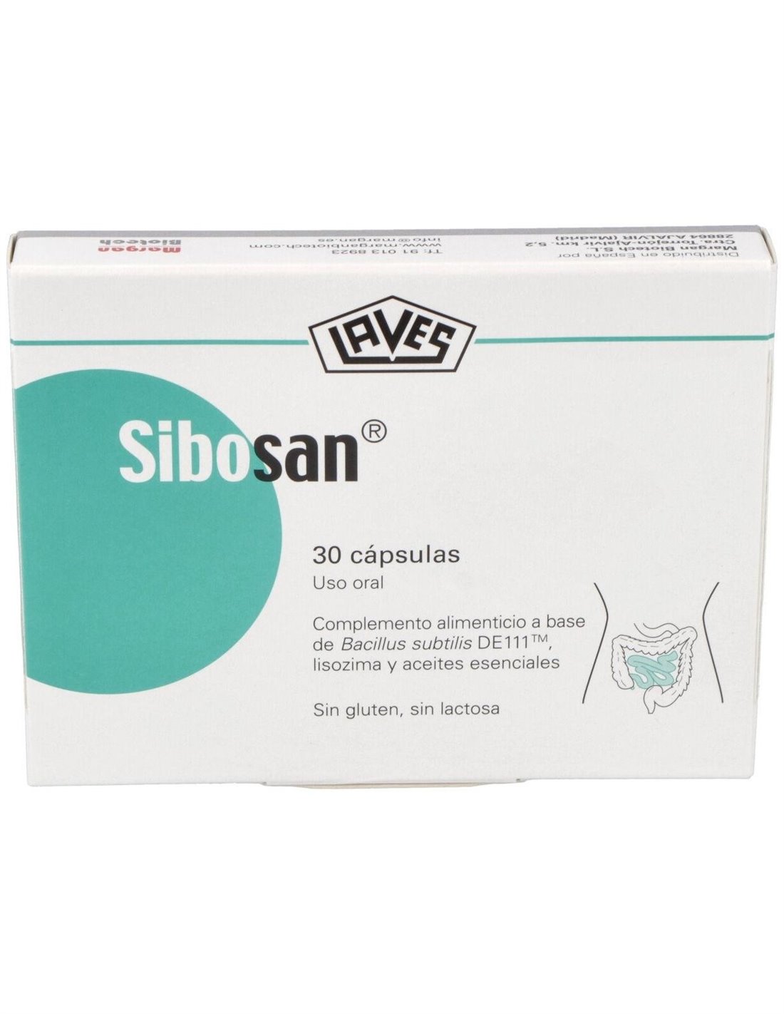 Sibosan® es un complemento alimenticio de gran calidad, que contribuye a mantener la salud de la función intestinal y el equilibrio natural de la flora del intestino delgado.Sibosan® contiene una combinación especial de bacterias probióticas (Bacillus subtilis DE111TM) en alta concentración (1 x109 bacterias), enzima natural lisozima y aceites esenciales.La cápsula es gastroresistente, protegiendo las sustancias activas y las bacterias probióticas ante los ácidos gástricos, hasta que llegar al intestino, donde deben actuar los componentes del Sibosan®, En su composición no contiene lactosa, gluten ni conservantes. Sibosan® también es apto para vegetarianos, gracias aque la envoltura de la cápsula no contiene ninguna sustancia de origen animal. Ingredientes: