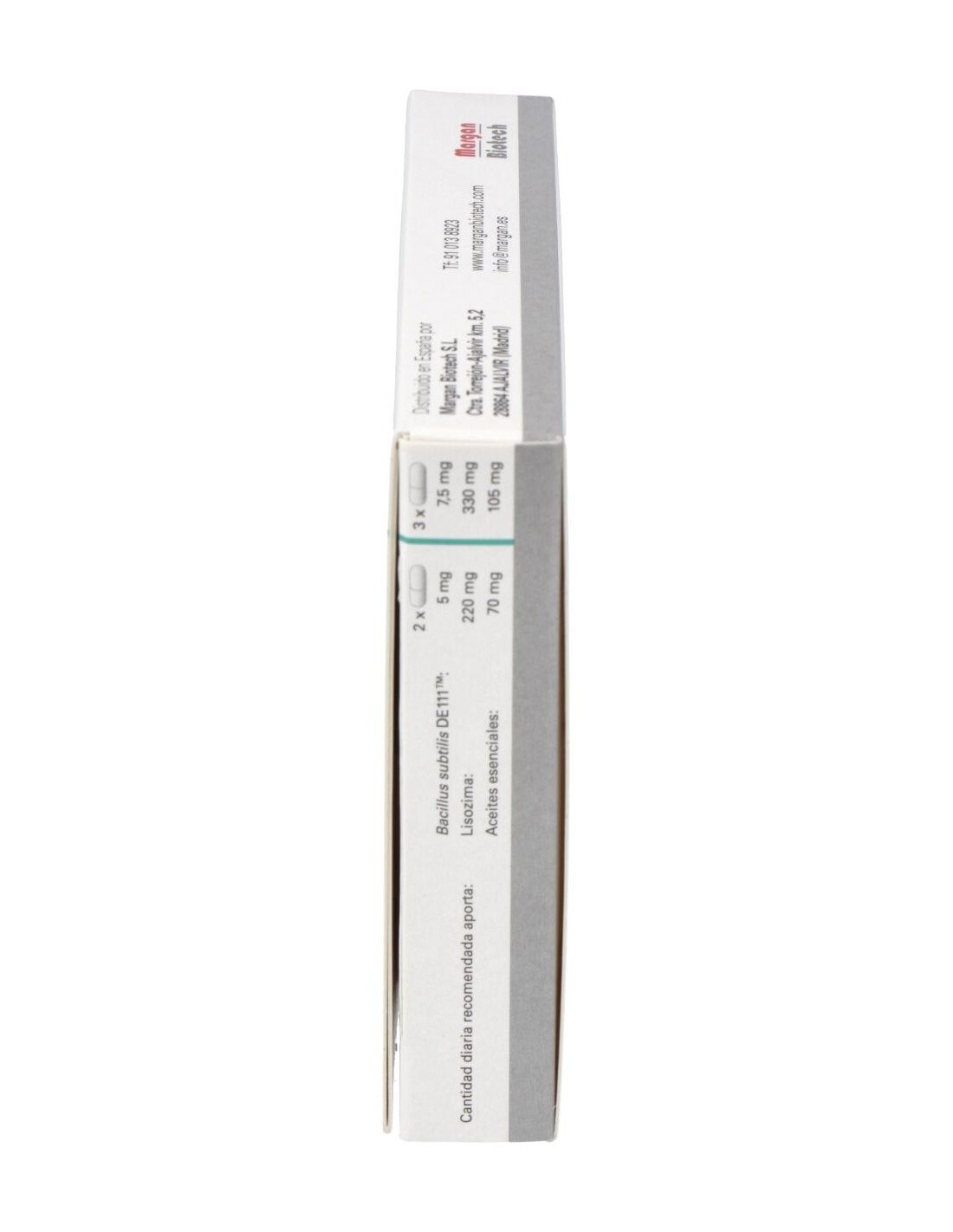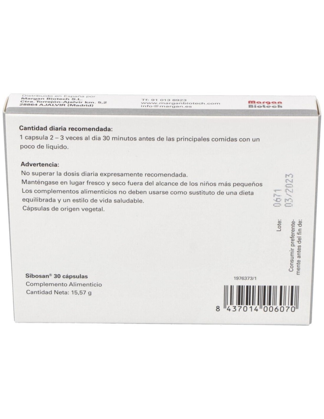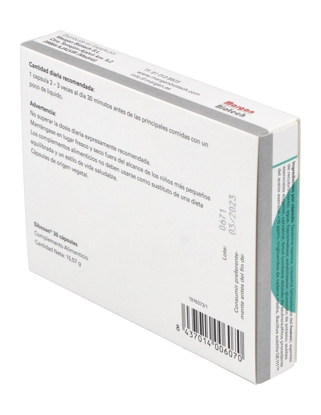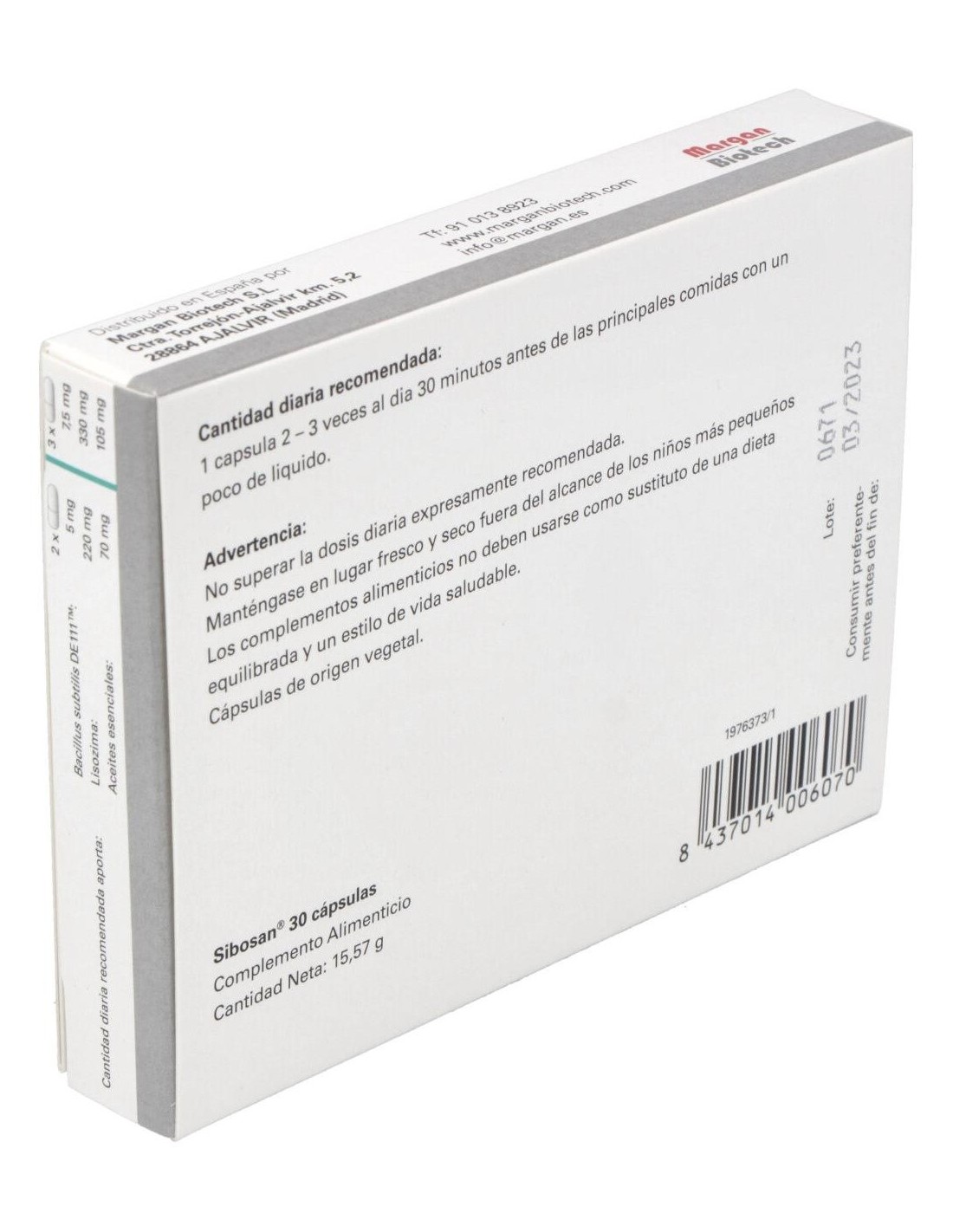 Sibosan® es un complemento alimenticio de gran calidad, que contribuye a mantener la salud de la función intestinal y el equilibrio natural de la flora del intestino delgado.Sibosan® contiene una combinación especial de bacterias probióticas (Bacillus subtilis DE111TM) en alta concentración (1 x109 bacterias), enzima natural lisozima y aceites esenciales.La cápsula es gastroresistente, protegiendo las sustancias activas y las bacterias probióticas ante los ácidos gástricos, hasta que llegar al intestino, donde deben actuar los componentes del Sibosan®, En su composición no contiene lactosa, gluten ni conservantes. Sibosan® también es apto para vegetarianos, gracias aque la envoltura de la cápsula no contiene ninguna sustancia de origen animal. Ingredientes: