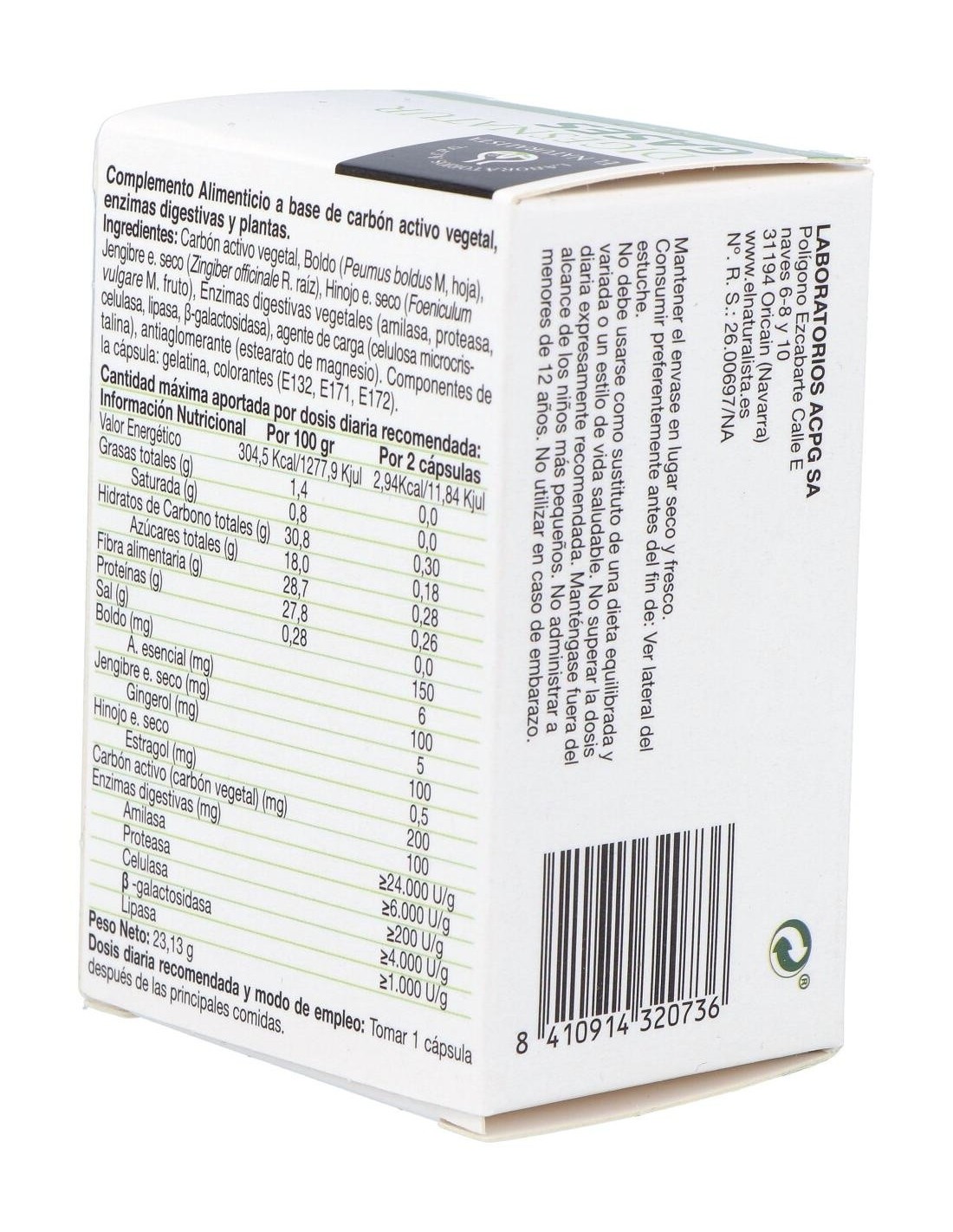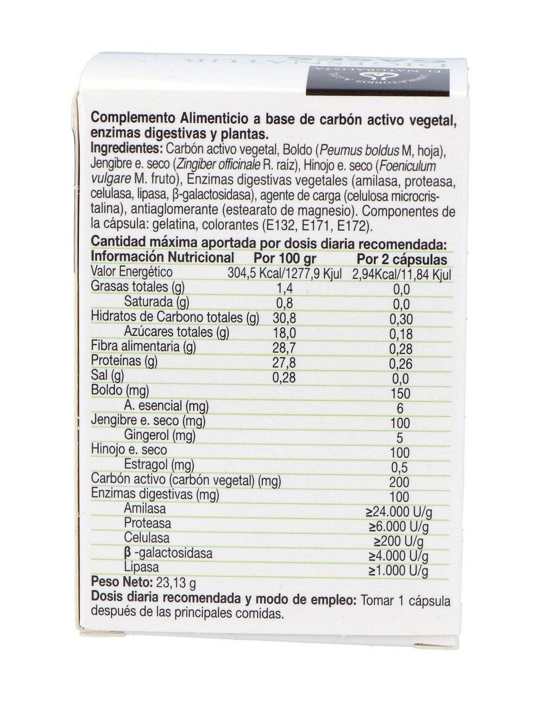 Carbón activo vegetal, Boldo (Peumus boldus M, hoja), Jengibre e. seco (Zingiber officinale R. raíz), Hinojo e. seco (Foeniculum vulgare M. fruto), Enzimas digestivas vegetales (amilasa, proteasa, celulasa, lipasa, ß-galactosidasa), agente de carga (celulosa microcristalina), antiaglomerante (estearato de magnesio). Componentes de la cápsula: gelatina, colorantes (E132, E171, E172).