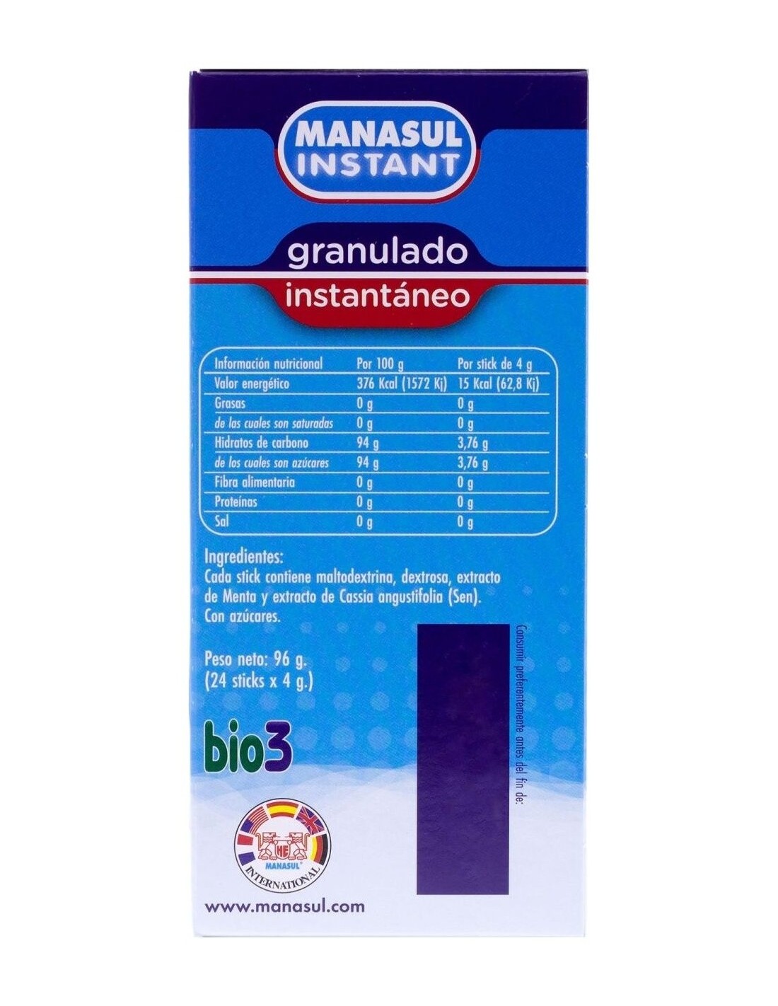 Los niños y mujeres embarazadas deberán consultar al médico antes de consumir Bio3 Manasul Instant.