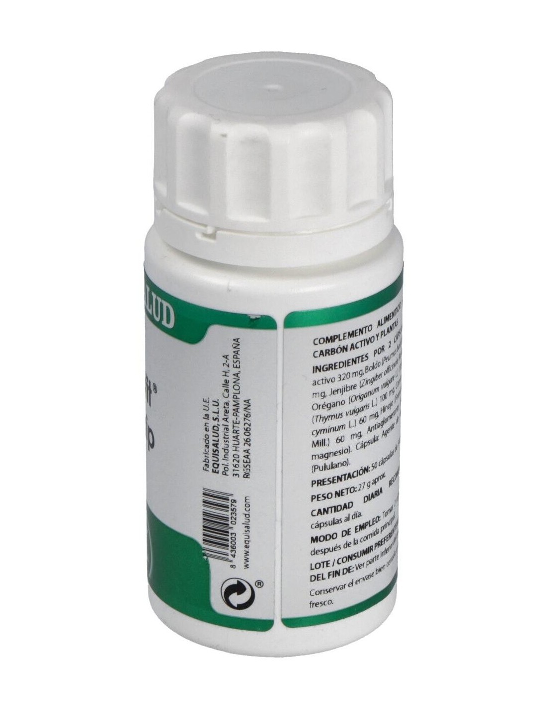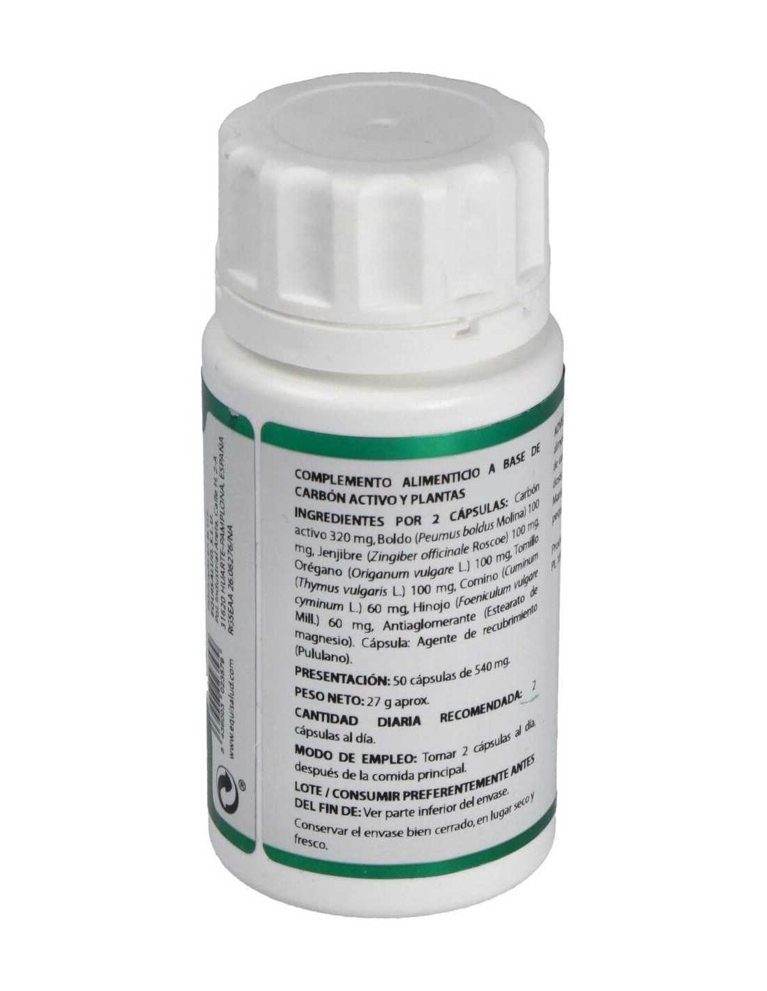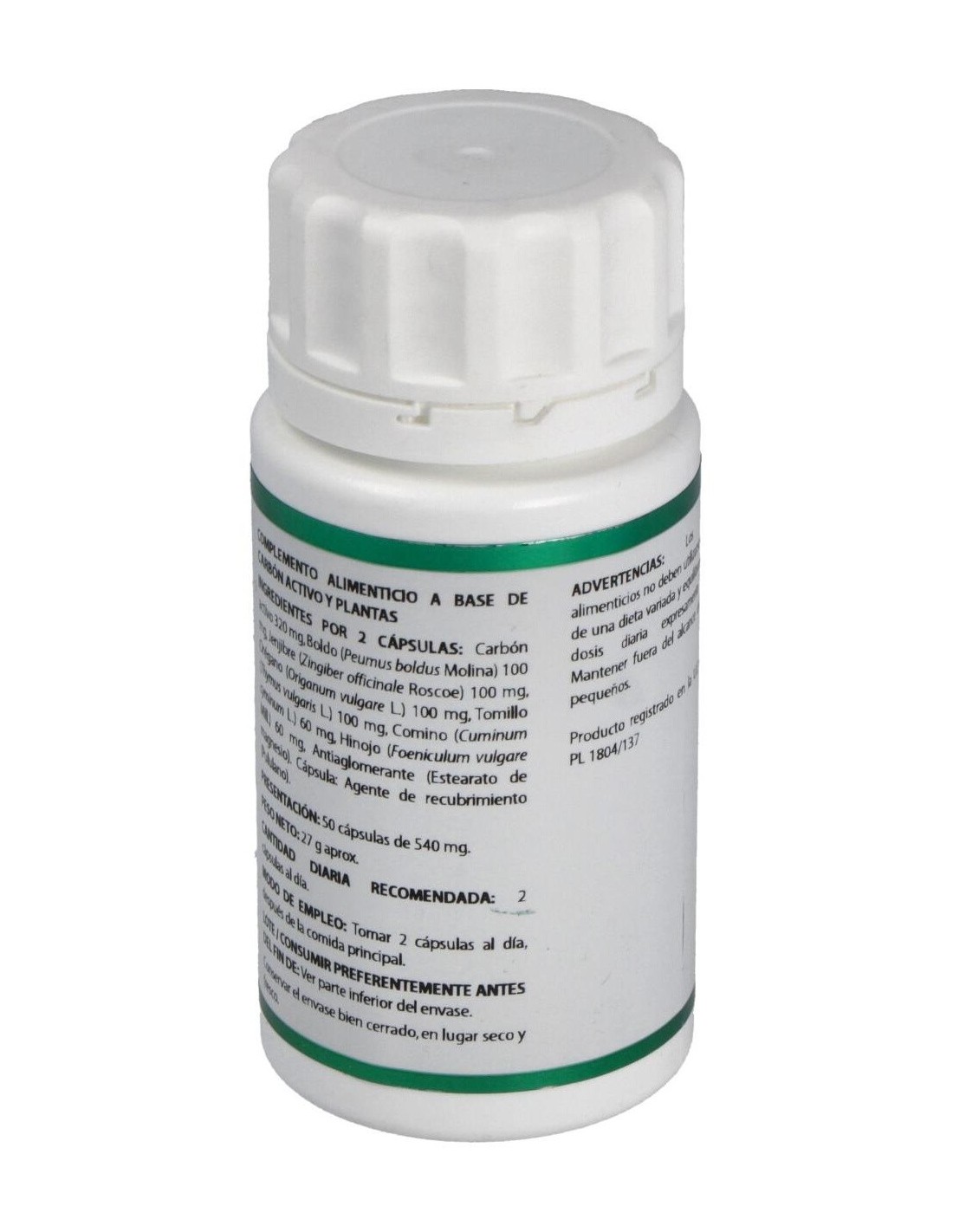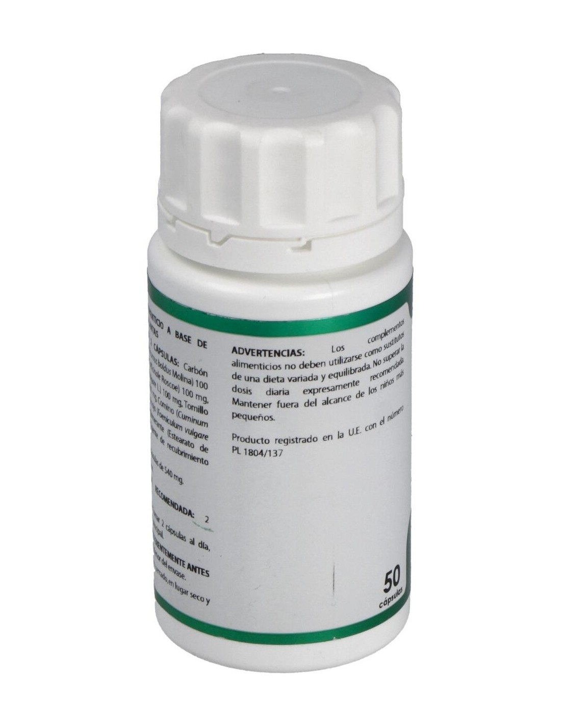 Está potenciado por plantas con acción facilitadora de la digestión, evitando la formación de gases. Por otro lado se emplean plantas con una potente acción antiséptica para combatir las bacterias dañinas que pueda haber.Composición:Carbón activado 160 mg, boldo extracto seco (Peumus boldo Molina, hojas, > 0,05% de boldina), 50 mg; jengibre extracto seco (Zingiber officinale Roscoe., raíz, > 5% de gingeroles), 50 mg; orégano extracto seco (Origanum vulgare L., hojas, > 2% de aceites esenciales), 50 mg; tomillo extracto seco (Thymus vulgaris L., hojas y flores, > 0,2% de timol), 50 mg; comino extracto seco (Cuminum cyminum, fruto), 30 mg; hinojo extracto seco (Foeniculum vulgare Mill., fruto, > 0,25% de anetol), 30 mg. Excipiente tecnológico: estearato de magnesio (E-572). c.sModo de empleo:Tomar 2 cápsulas después de cada comida principal.Presentación:Envase de 50 cápsulas.