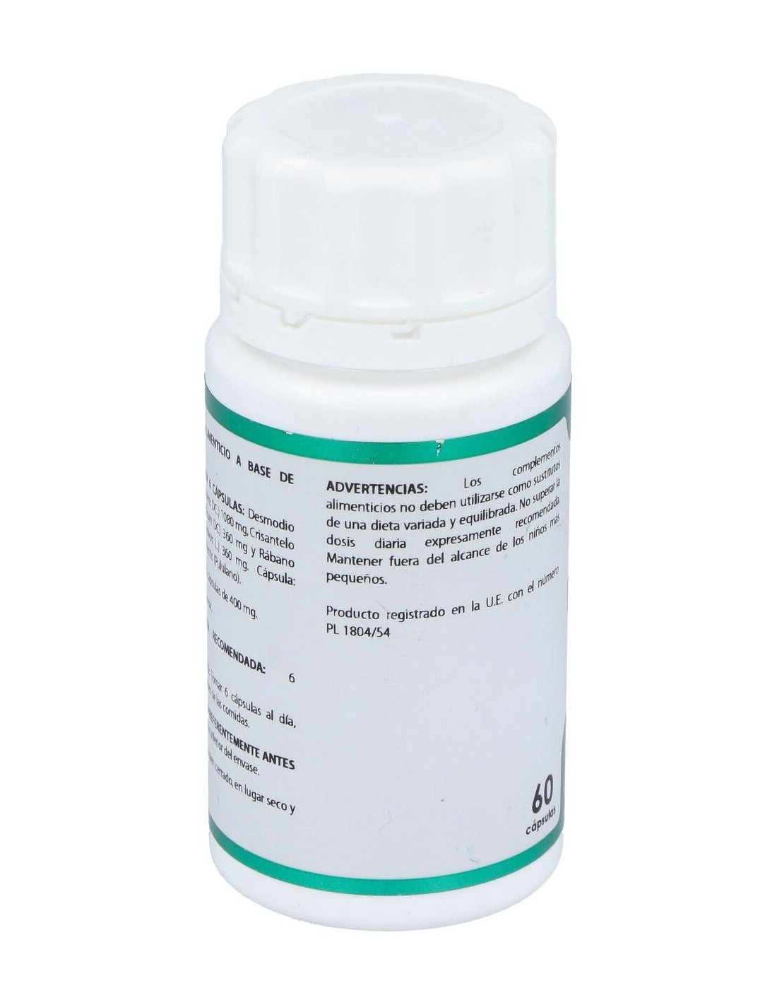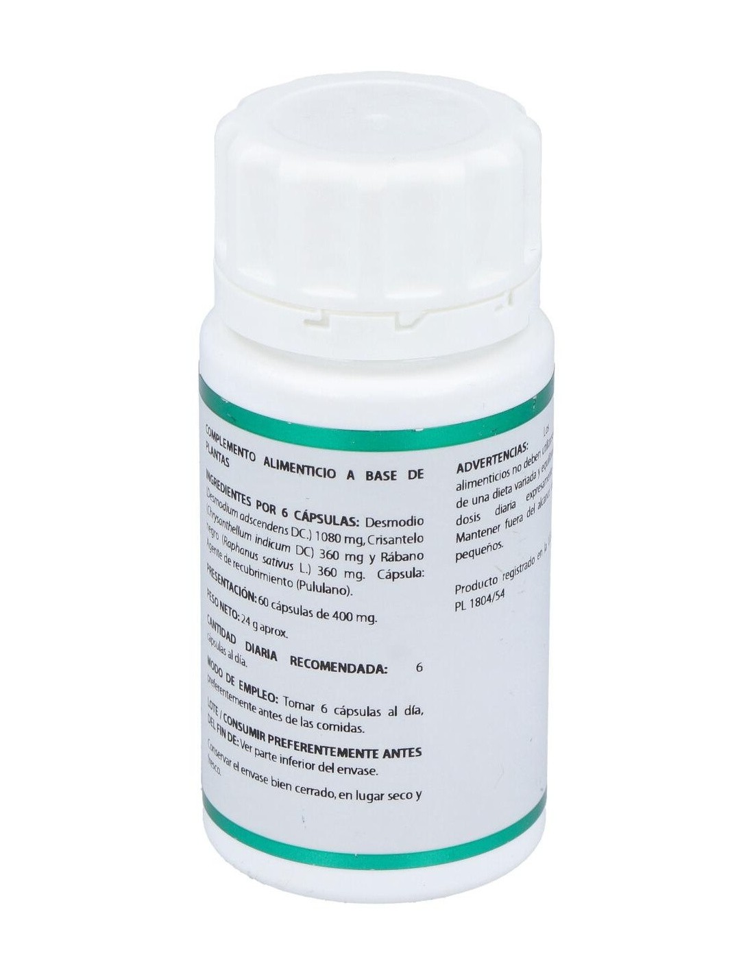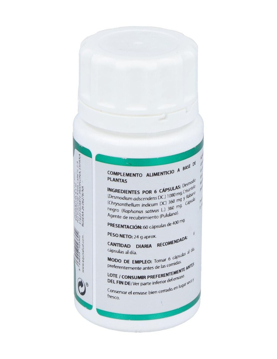 Desmodio (Desmodium adscendens): El desmodio es utilizado en la medicina tradicional para el tratamiento de diversas afecciones hepáticas entre las que se incluye hepatitis virales agudas y tóxicas producidas por medicamentos o alcohol y cirrosis hepática. Contiene saponinas triterpénicas, derivados de la quinoleína y ß-feniletilaminas. Composición:Crisantemo extracto nebulizado (Chrysantemum indicum, parte aérea, >3% flavonoides), 60 mg; desmodio polvo (Desmodium ascendens, hoja), 180 mg; rábano negro polvo (Raphanus sativus, raíz, > 0,0025 % glucosinolatos), 60 mg. Modo de empleo:Tomar 6 cápsulas al día, preferentemente antes de las comidas. Presentación:Envase de 60 cápsulas.