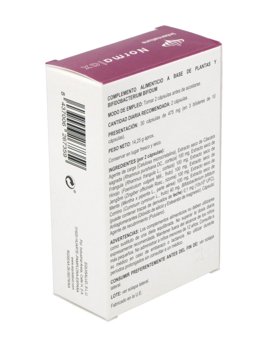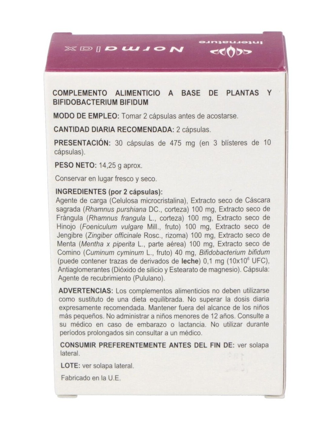 Modo de empleo:Tomar 2 cápsulas al acostarse, para producir un efecto laxante 8 horas después. Presentación:Envase de 30 cápsulas.