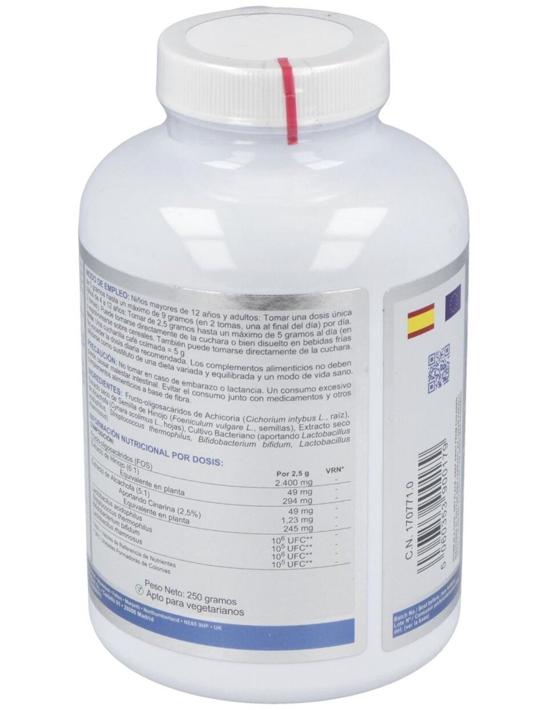 El producto está elaborado con ingredientes seleccionados para asegurar una textura fina y homogénea, facilitando su mezcla en líquidos o recetas. Su diseño en polvo permite una dosificación flexible según las necesidades individuales.