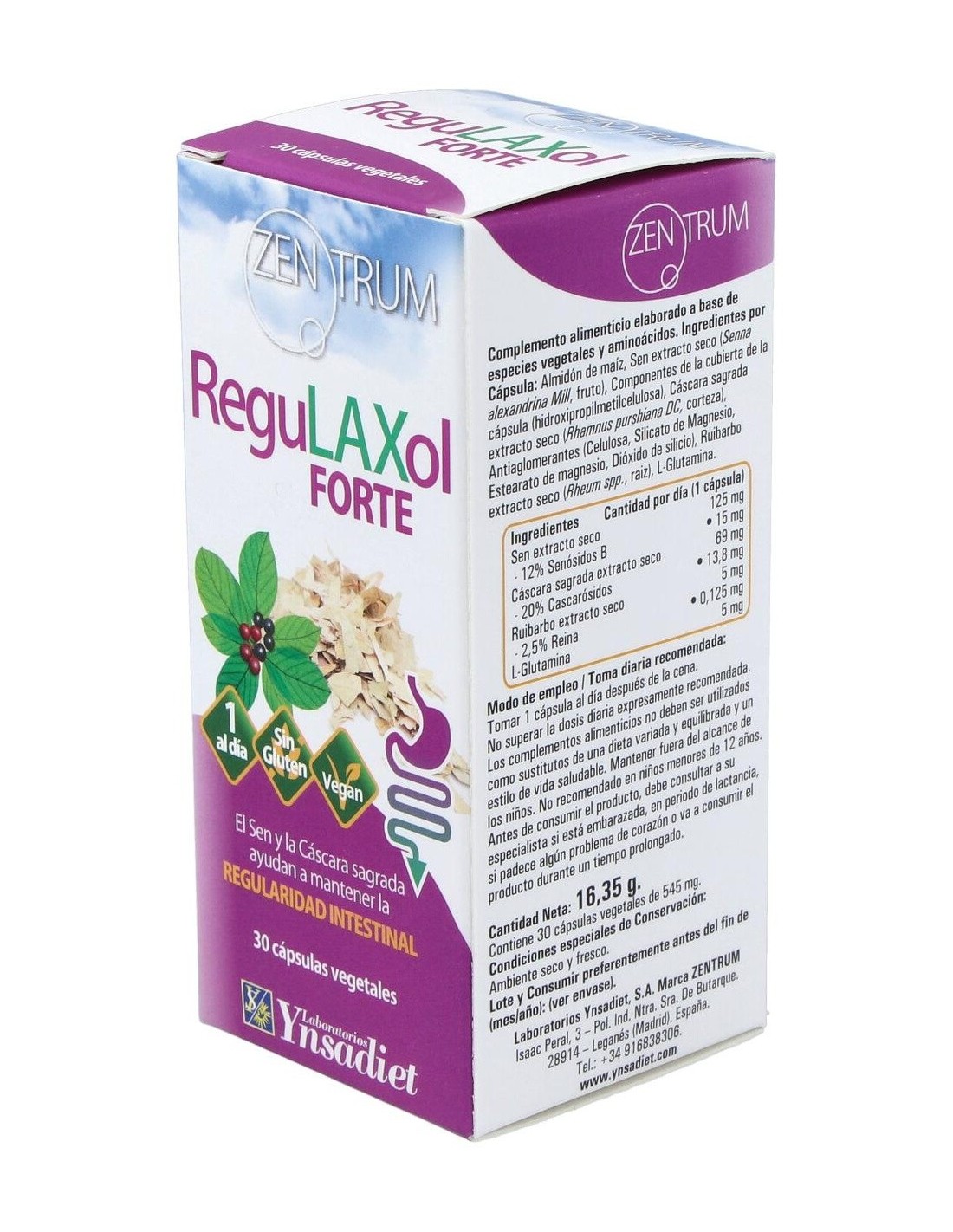 Contiene sen y cáscara sagrada, que facilitan los movimientos peristálticos del intestino grueso.