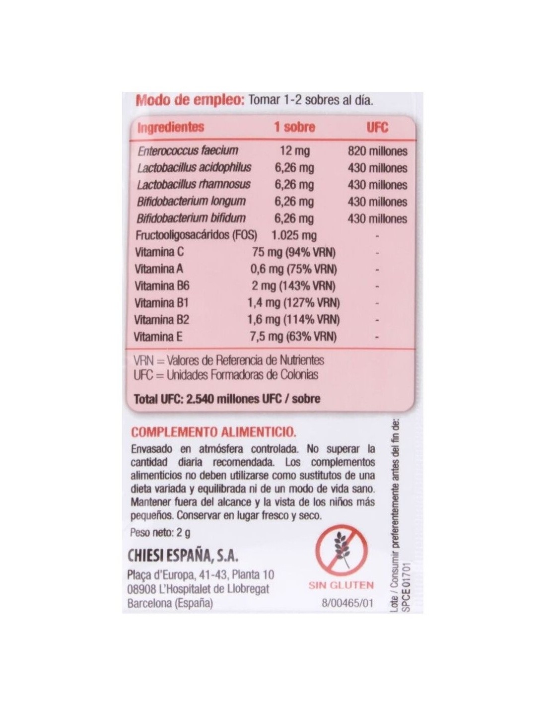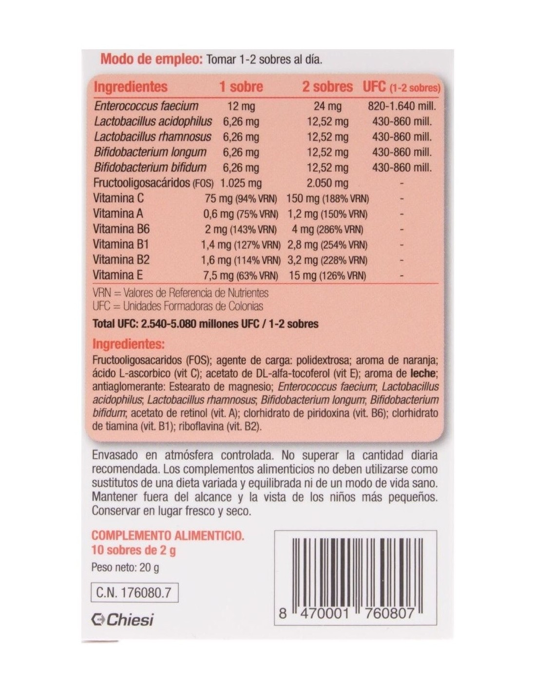 ENTEROCOCCUS FAECIUM, LACTOBACILLUS ACIDOPHILUS, LACTOBACILLUS RHAMNOSUS, BIFIDOBACTERIUM LONGUM, BIFIDOBACTERIUM BIFIDUM, FRUCTOOLIGOSACÁRIDOS (FOS), VITAMINA C, VITAMINA A, VITAMINA B6, VITAMINA B1, VITAMINA B2, VITAMINA E