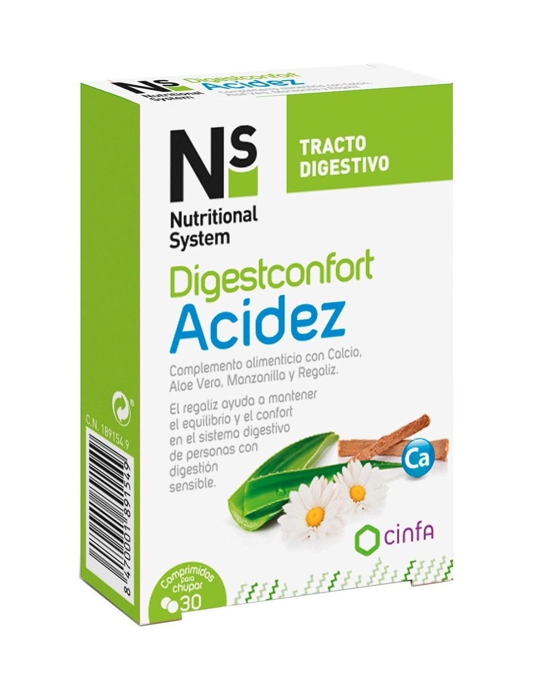 Complemento alimenticio que combina Calcio, Aloe vera, Manzanilla y Regaliz para ayudar a aliviar la acidez y el reflujo de forma natural. El Calcio contribuye al funcionamiento normal de las enzimas digestivas. Recomendado para adultos y adolescentes. Comprimidos para chupar de sabor mentolado.