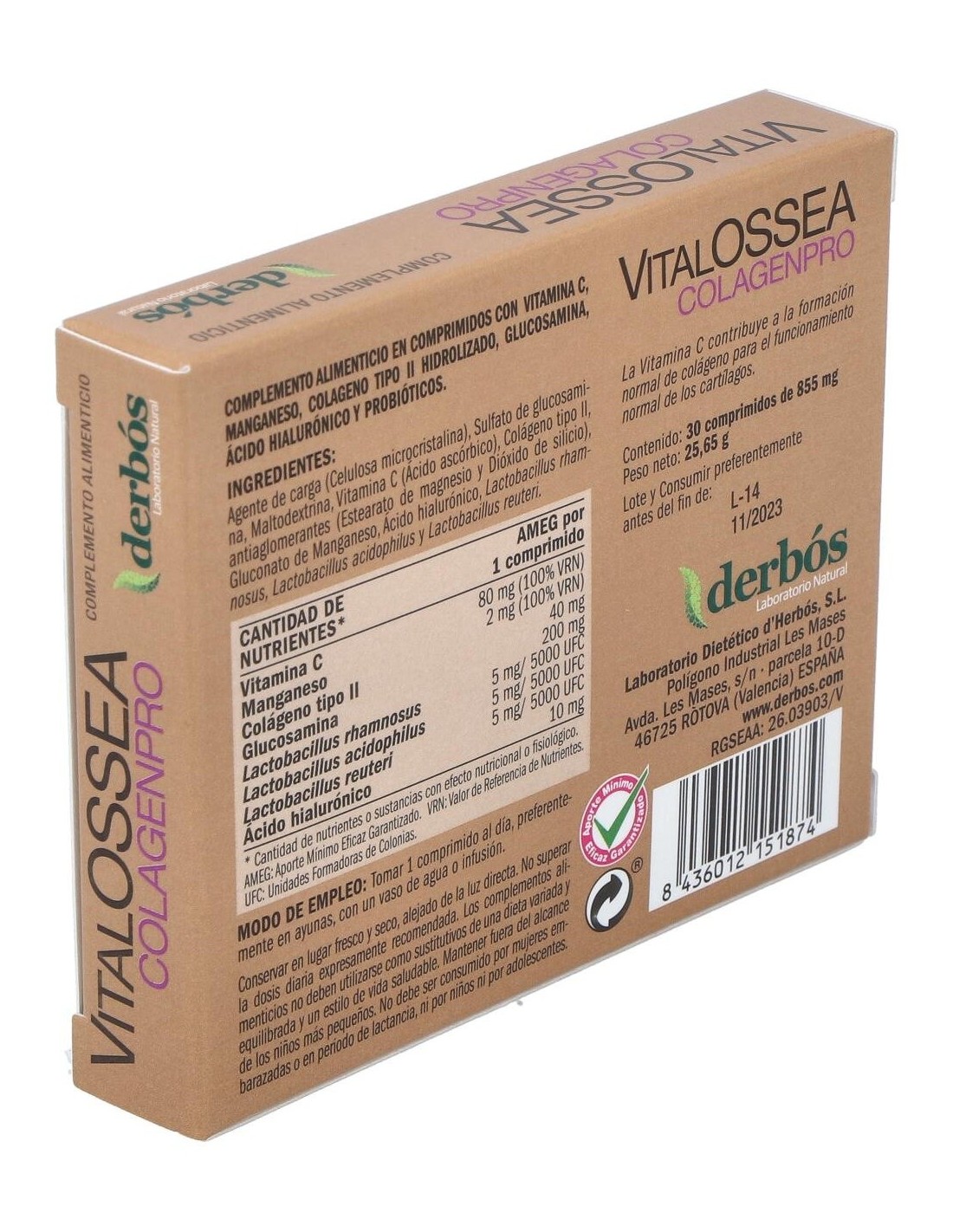 Complemento alimenticio en comprimidos con vitamina C, manganeso, colágeno tipo II, glucosamina, ácido hialurónico y probióticos. La vitamina C contribuye a la formación normal de colágeno para aelfuncionamiento normal de los cartílagos.