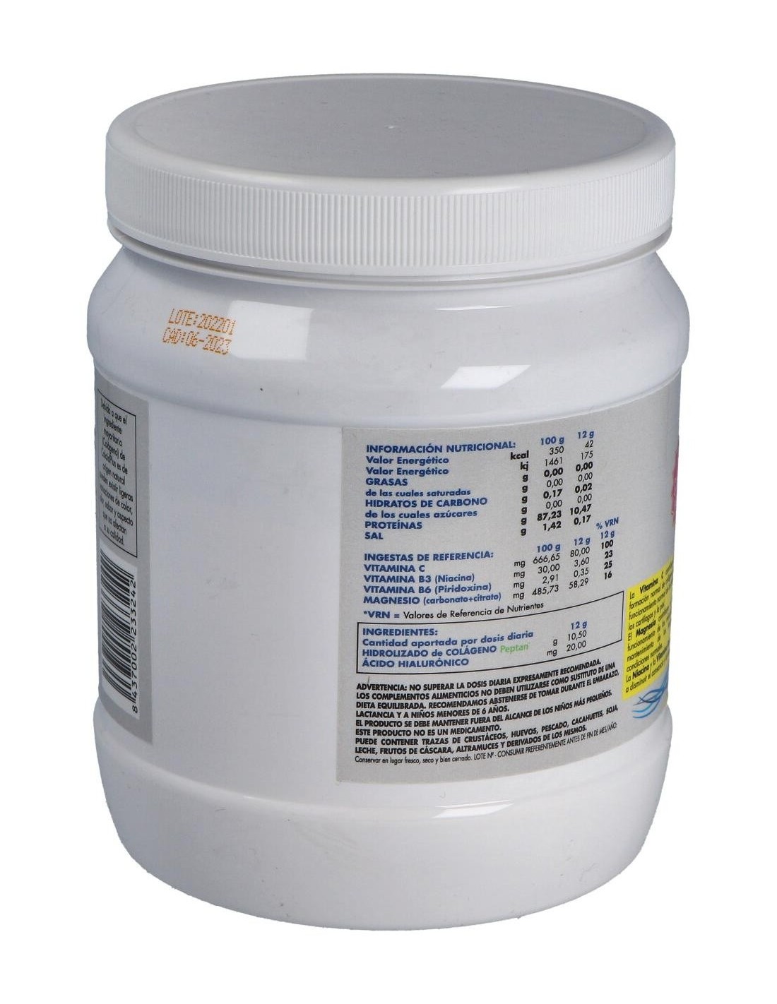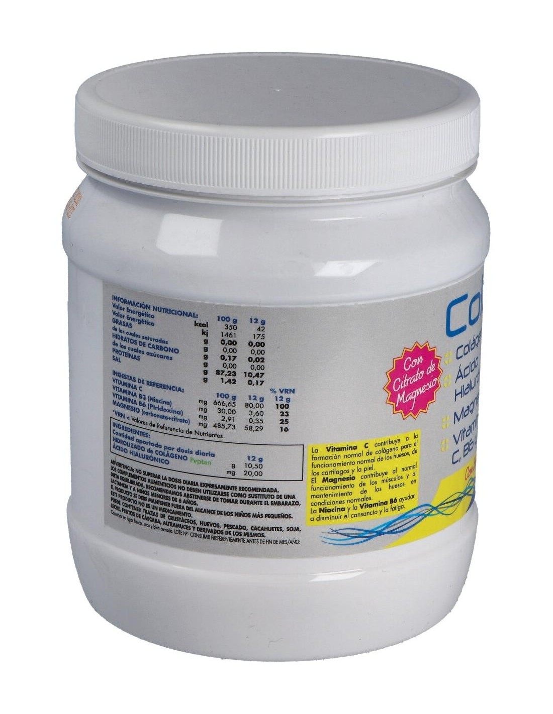 Es un complemento alimenticio compuesto por colágeno hidrolizado, ácido hialurónico, magnesio y vitaminas C, B6 y B3. Ayuda a mantener los niveles de colágeno y ácido hialurónico, favoreciendo un mejor estado de nuestras articulaciones, cartílagos, huesos y piel. El magnesio y las vitaminas favorecen el buen funcionamiento de la estructura muscular y ósea. Este producto no sustituye a una dieta variada y equilibrada. No puede tomarse durante el embarazo, lactancia o niños menores a los 6 años.