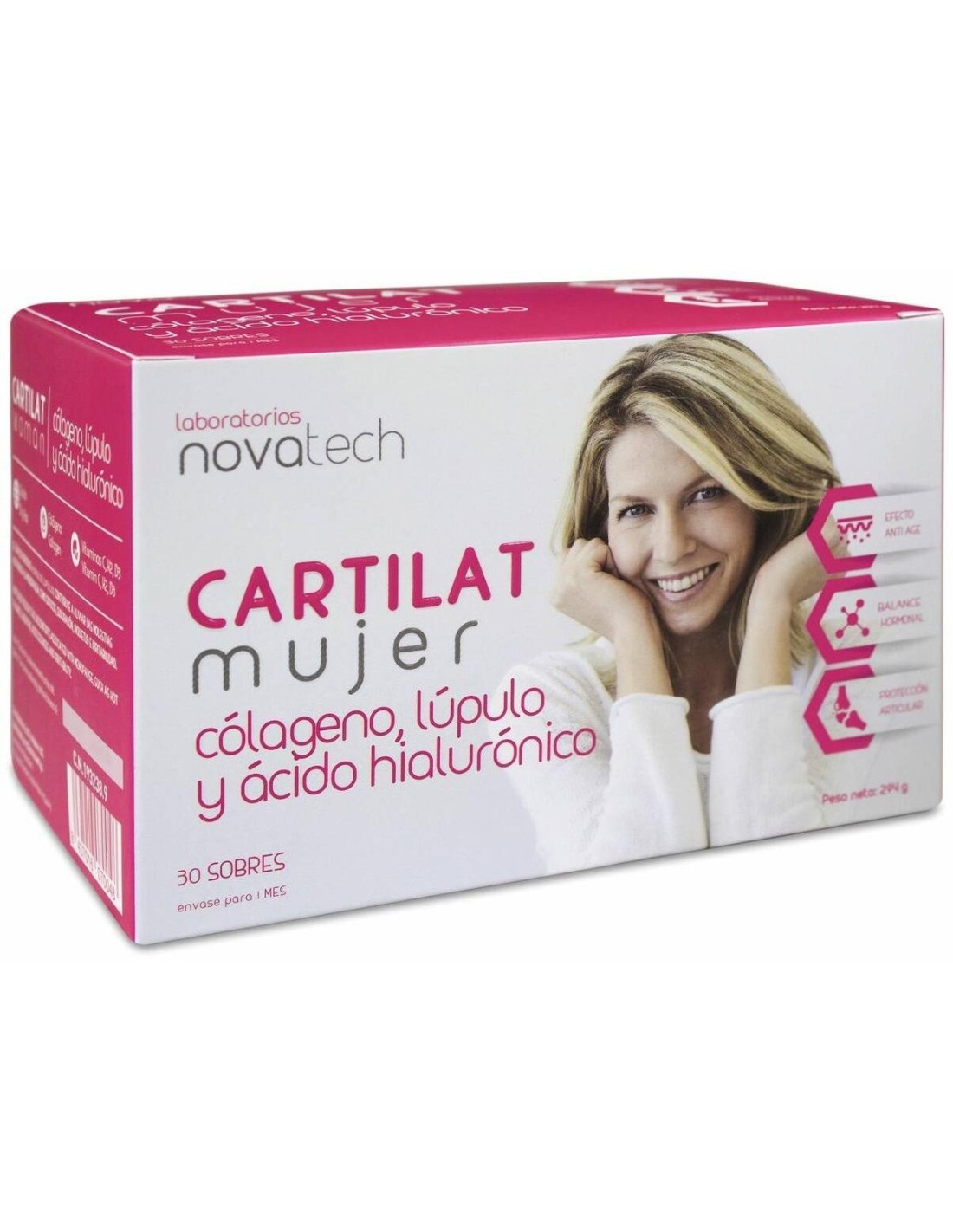El Cartilat Mujer 30Sbrs. de Novatech es un suplemento nutricional para mujeres que contribuye al cuidado articular mediante su fórmula con colágeno y nutrientes específicos.