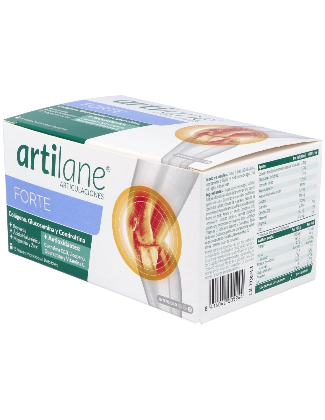 Artilane Forte contiene glucosamina, condroitina, colágeno hidrolizado enzimáticamente, ácido hialurónico, magnesio, zinc, boswelia y antioxidantes como Coenzima Q10, licopeno, quercetina y vitamina C.