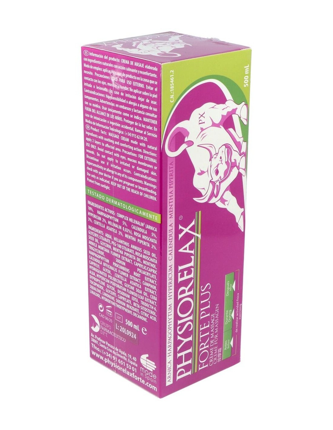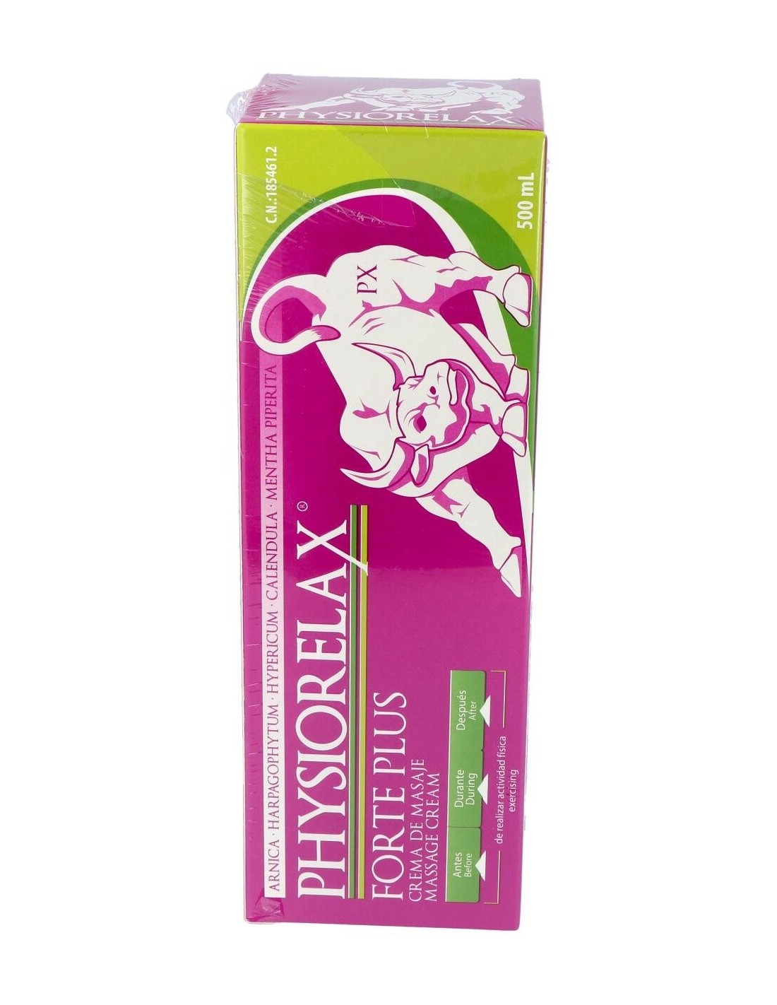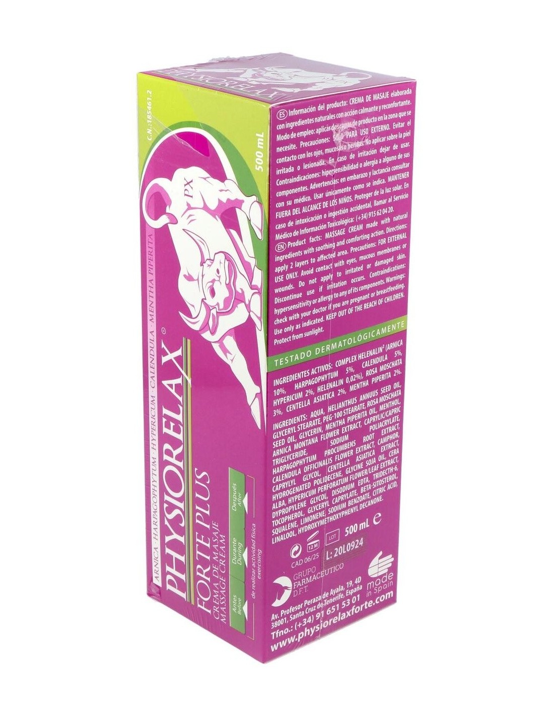 Physiorelax Forte Plus es una crema de masaje con una completa fórmula que prepara, protege y recupera tus músculos y ligamentos. Es altamente efectiva tanto en la práctica deportiva como contra la fatiga que genera la actividad cotidiana.Physiorelax Forte Plus ha sido elaborada con un complejo de aceites esenciales, el Helenalin, que contiene árnica, harpagofito, hipérico, caléndula y helenalina, el compuesto principal del Árnica Montana. Todos son ingredientes con propiedades antiinflamatorias, calmantes y cicatrizantes científicamente demostradas.A diferencia de otras cremas, Physiorelax Forte Plus no solo actúa en tus músculos y ligamentos. Gracias a su contenido en rosa mosqueta y centella asiática, también cuida tu piel, regenerándola y nutriéndola en profundidad.Ingredientes activos:Árnica (Arnica Montana), Harpagofito (Harpagophytum Procumbens), Hipérico (Hypericum Perforatum), Caléndula (Calendula Officinalis), Rosa Mosqueta, Menta (Mentha Piperita), Agua Termal.Modo de empleo:Aplicar dos capas de producto en la zona antes, durante y después del ejercicio físico.Presentación:Envase de 500 ml.